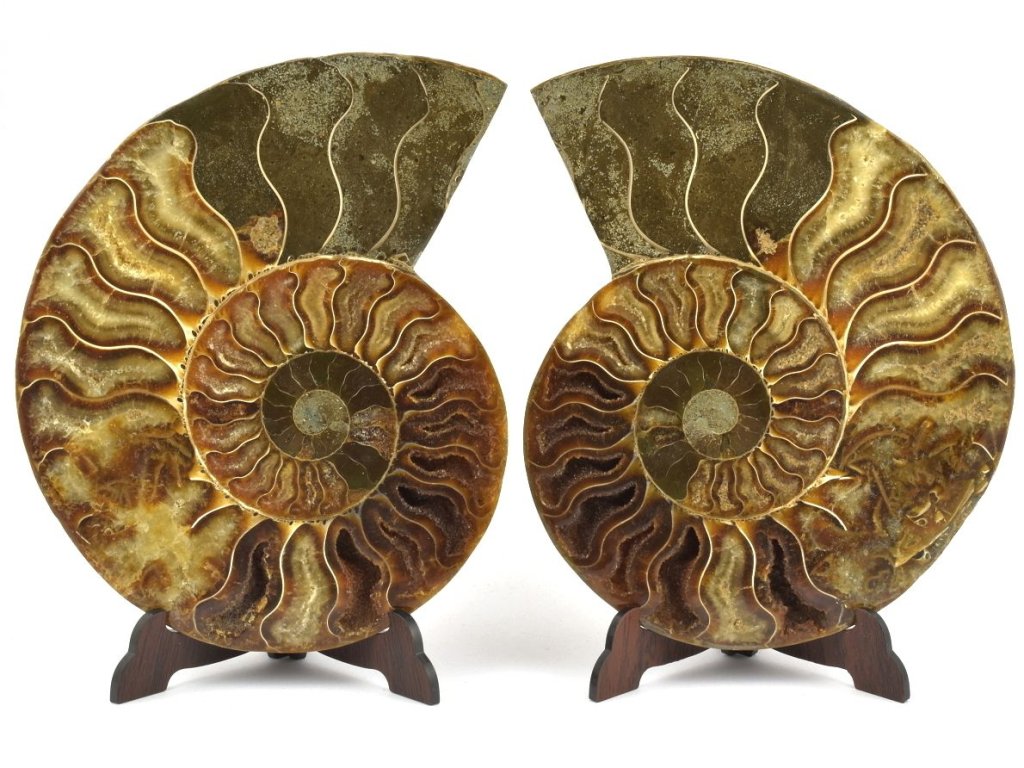 Rozřízlý a vyleštěný jedinec amonita rodu Cleoniceras z Madagaskaru s dobře patrnou vnitřní stavbou komůrek.