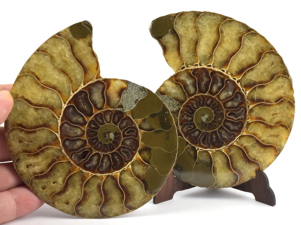 Rozřízlý a vyleštěný jedinec amonita rodu Cleoniceras z Madagaskaru s dobře patrnou vnitřní stavbou komůrek.