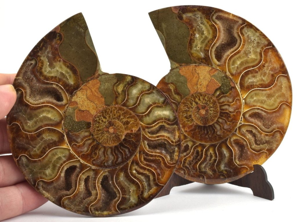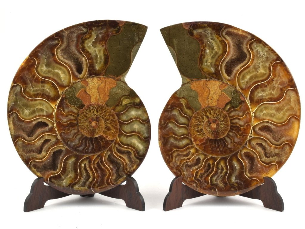 Rozřízlý a vyleštěný jedinec amonita rodu Cleoniceras z Madagaskaru s dobře patrnou vnitřní stavbou komůrek.