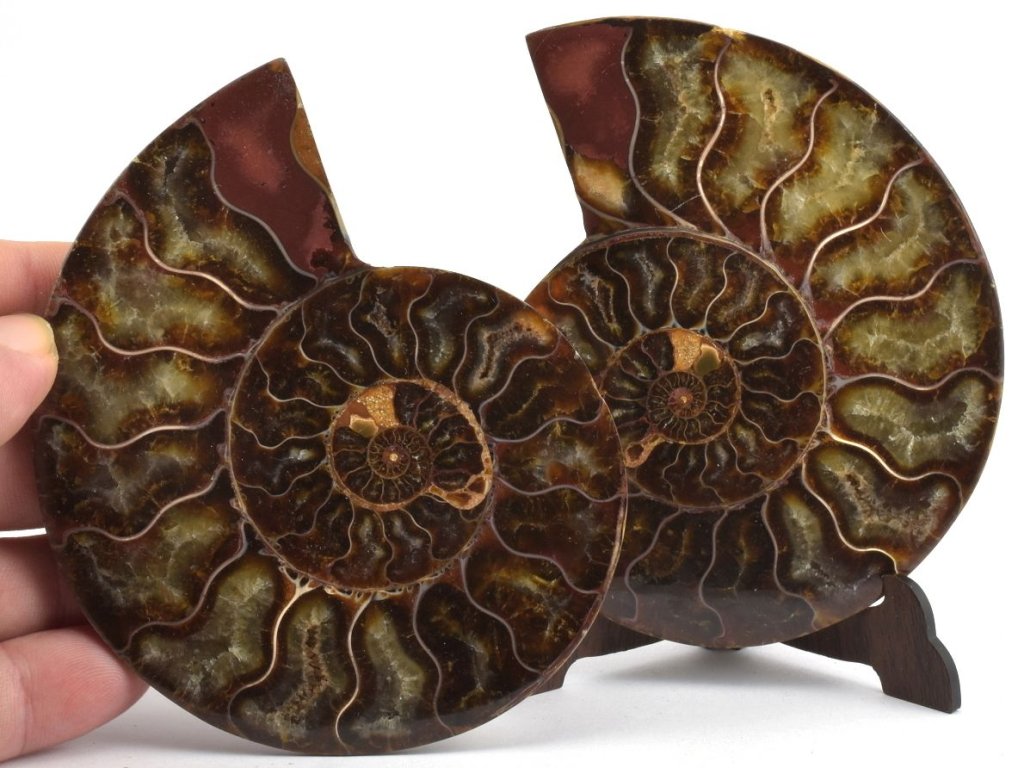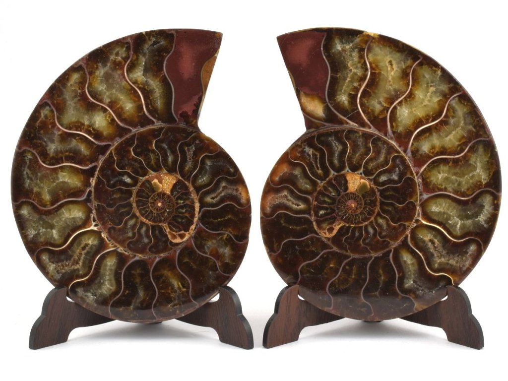 Rozřízlý a vyleštěný jedinec amonita rodu Cleoniceras z Madagaskaru s dobře patrnou vnitřní stavbou komůrek.