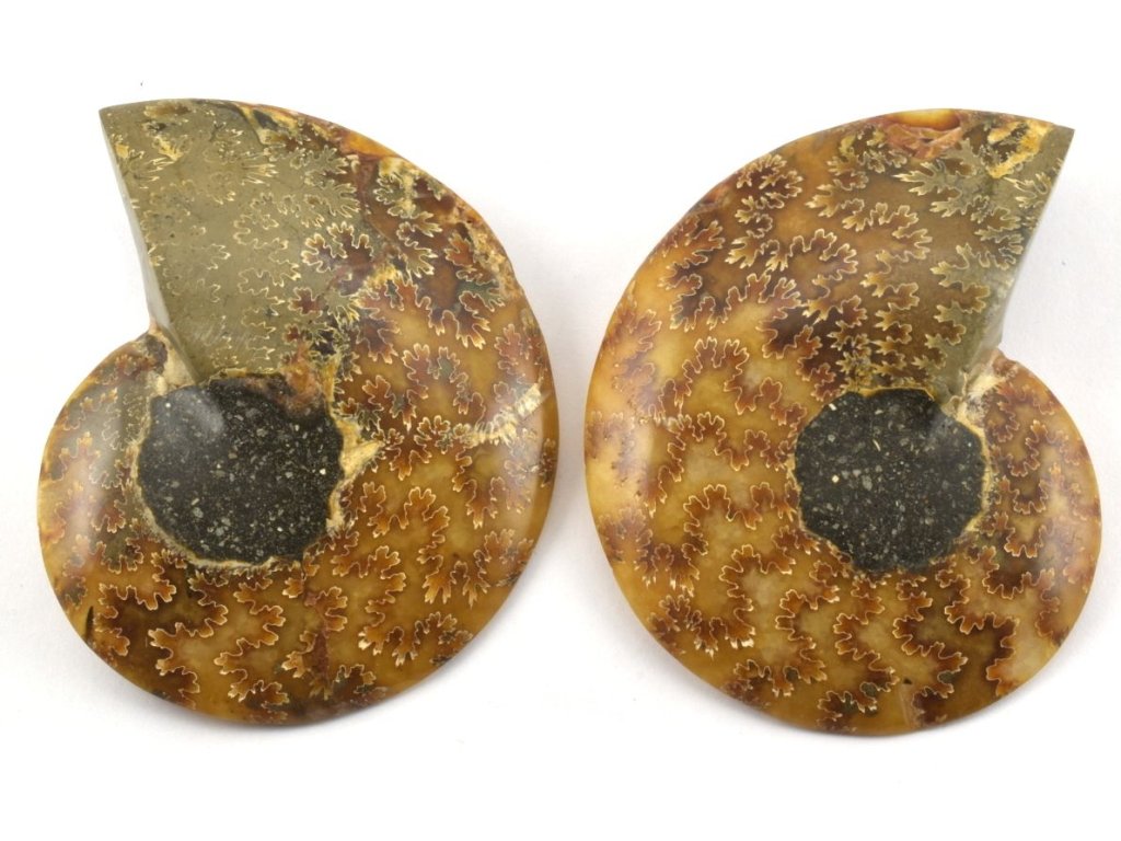 Rozřízlý a vyleštěný jedinec amonita rodu Cleoniceras z Madagaskaru s dobře patrnou vnitřní stavbou komůrek.