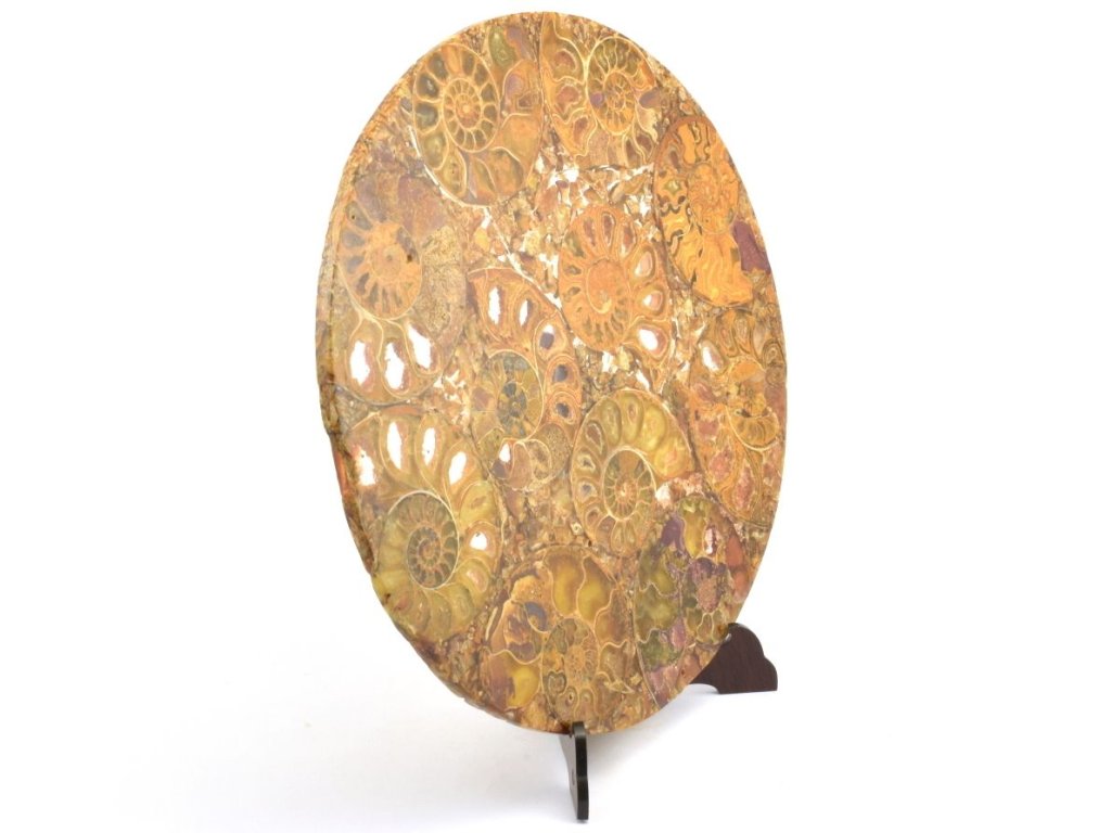 Kruhová deska o průměru 20 cm je složena z leštěných řezů zkamenělých schránek amonitů, zalitých v epoxidové pryskyřici. Plastový skládací stojánek o velikosti 11,5 cm je součástí balení a umožňuje snadné vystavení této výjimečné dekorace. Dekorační amonitová deska z Madagaskaru jistě oživí každý interiér.