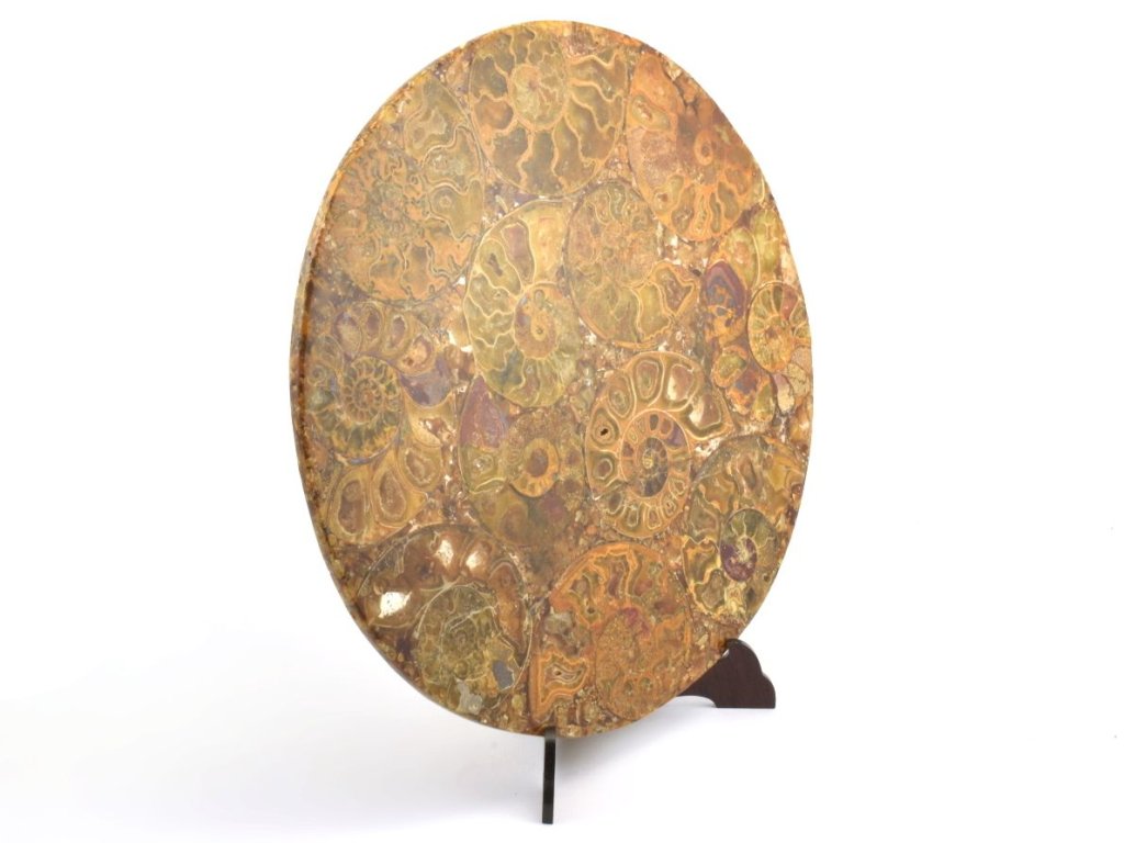Kruhová deska o průměru 20 cm je složena z leštěných řezů zkamenělých schránek amonitů, zalitých v epoxidové pryskyřici. Plastový skládací stojánek o velikosti 11,5 cm je součástí balení a umožňuje snadné vystavení této výjimečné dekorace. Dekorační amonitová deska z Madagaskaru jistě oživí každý interiér.
