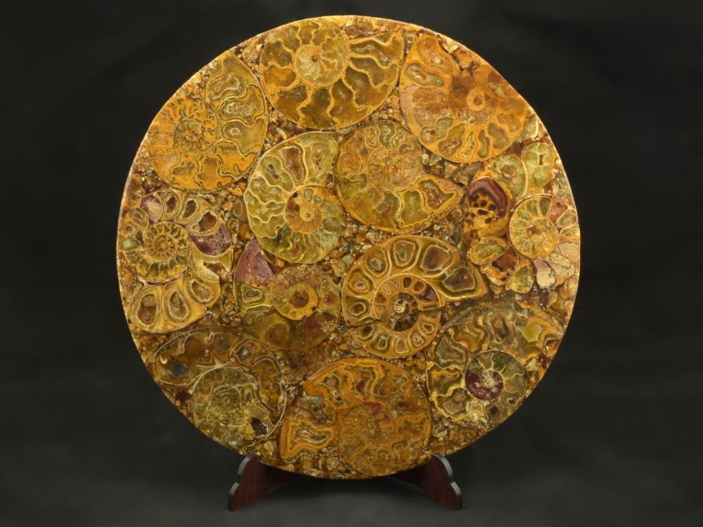 Zkamenělé schránky amonitů, tvořící desku, mají často vnitřní komůrky vyplněné žlutým kalcitem. Amoniti pocházejí z Madagaskaru, kde byly jejich schránky nařezány, vyleštěny a zality do pryskyřice. Na desce najdete exempláře různých velikostí a několika druhů, mezi nimiž dominuje rod Cleoniceras, známý svou úzkou a vysokou schránkou. Tento druh byl pravděpodobně skvělým plavcem, což dokládají jeho tvarové charakteristiky.