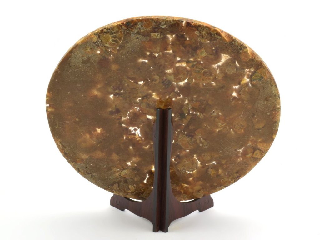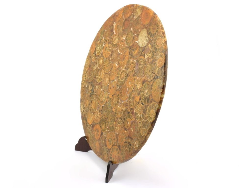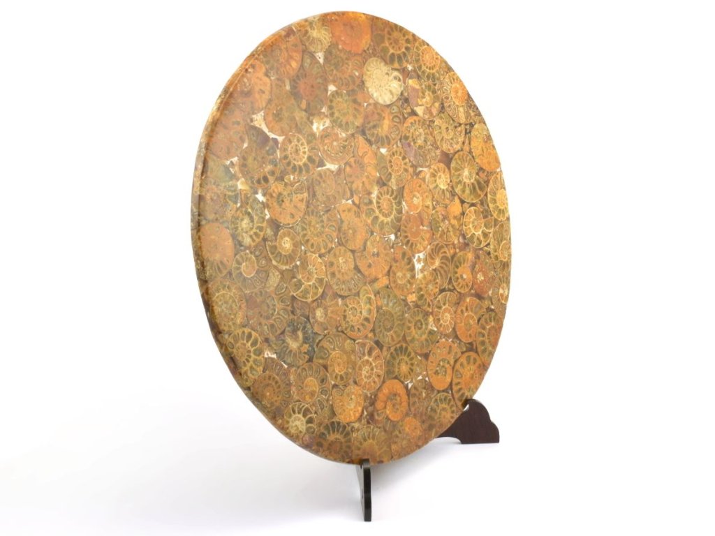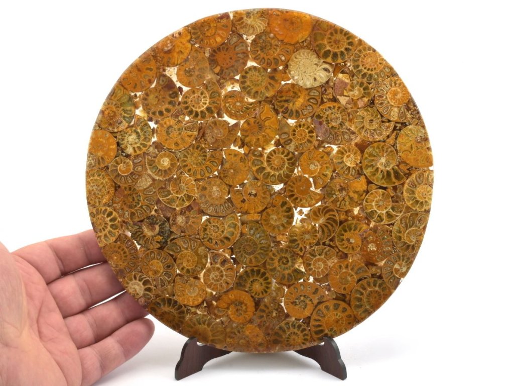 Kruhová deska o průměru 20 cm je složena z leštěných řezů zkamenělých schránek amonitů, zalitých v epoxidové pryskyřici. Plastový skládací stojánek o velikosti 11,5 cm je součástí balení a umožňuje snadné vystavení této výjimečné dekorace. Dekorační amonitová deska z Madagaskaru jistě oživí každý interiér.