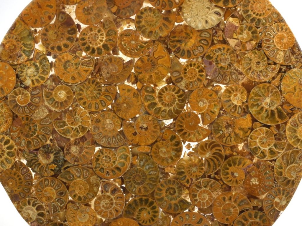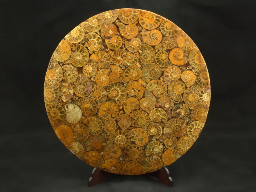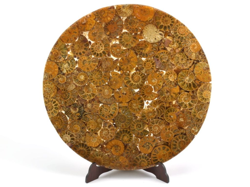 Zkamenělé schránky amonitů, tvořící desku, mají často vnitřní komůrky vyplněné žlutým kalcitem. Amoniti pocházejí z Madagaskaru, kde byly jejich schránky nařezány, vyleštěny a zality do pryskyřice. Na desce najdete exempláře různých velikostí a několika druhů, mezi nimiž dominuje rod Cleoniceras, známý svou úzkou a vysokou schránkou. Tento druh byl pravděpodobně skvělým plavcem, což dokládají jeho tvarové charakteristiky.