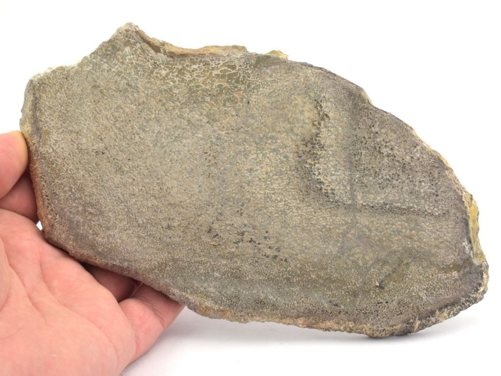 Kost je oboustranně vyleštěna, aby se odhalila její vnitřní struktura. Plátek není po celé své délce stejně silný. Síla plátku kolísá v rozmezí uvedeného v popisu výše. Kosti prošly procesem petrifikace (zkamenění), ve které byl původní fosilní materiál nahrazen oxidem křemičitým a jinými minerály. Vnitřní struktura kosti však zůstala zachována a je na řezu velmi dobře viditelná.