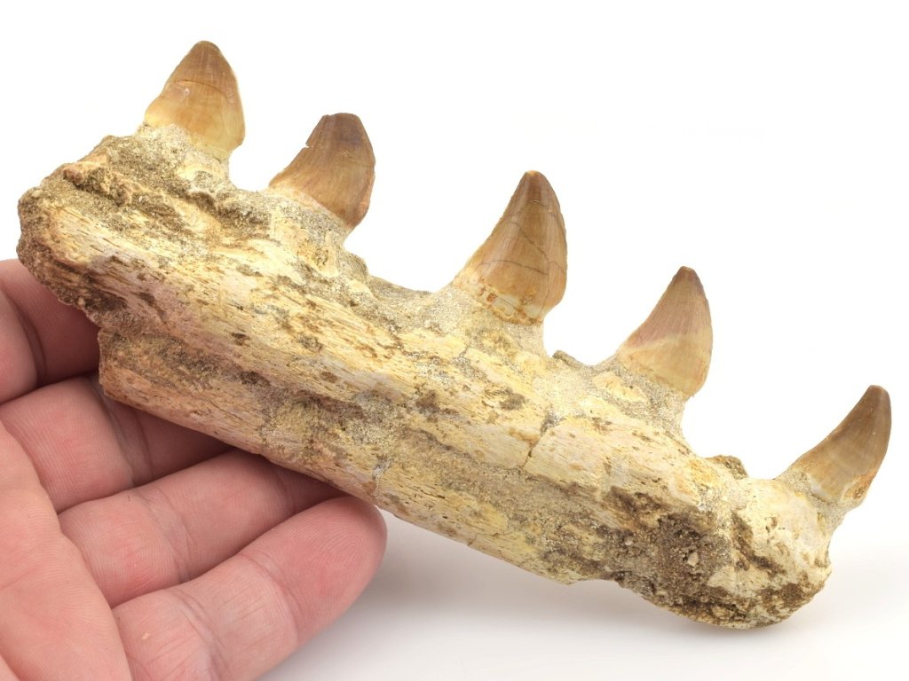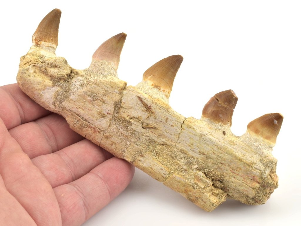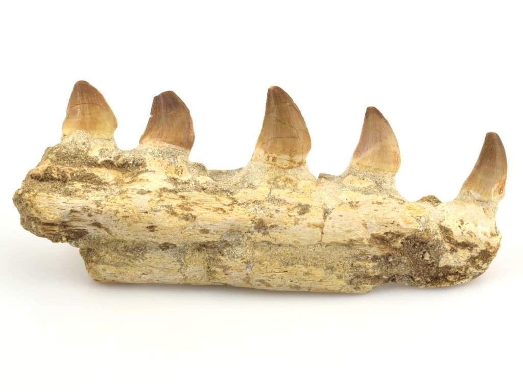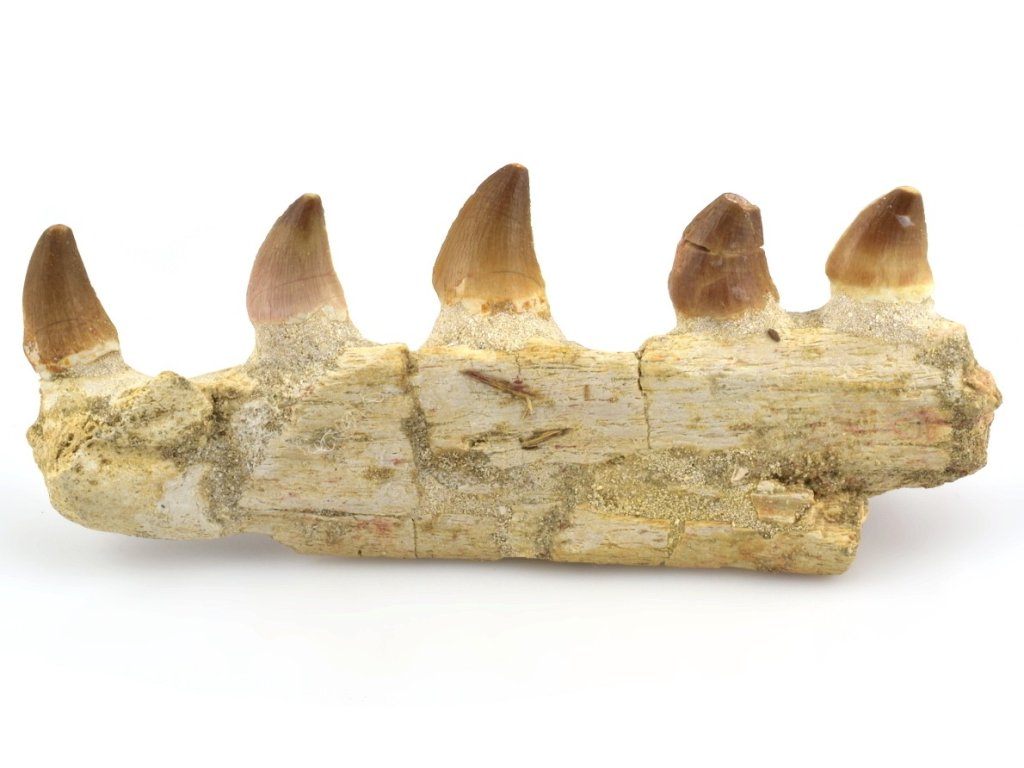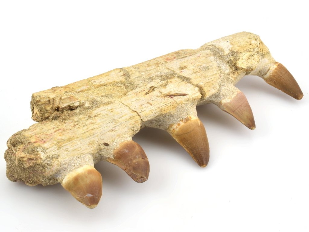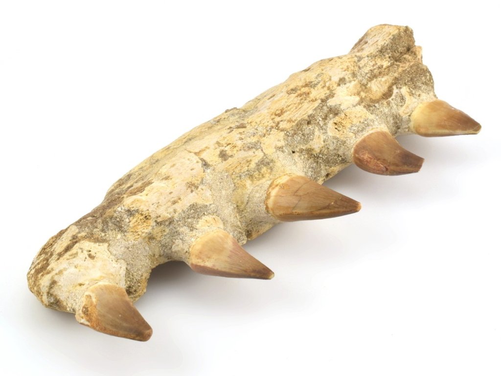 Zkamenělý úlomek čelisti blíže neurčeného druhu mosasaura pocházející z Maroka.