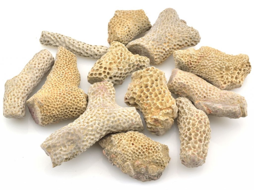 Balení 50 g zkamenělých mechovek (Bryozoa) ze Sahary. Pěkně zachovalé zkameněliny svrchního ordoviku.