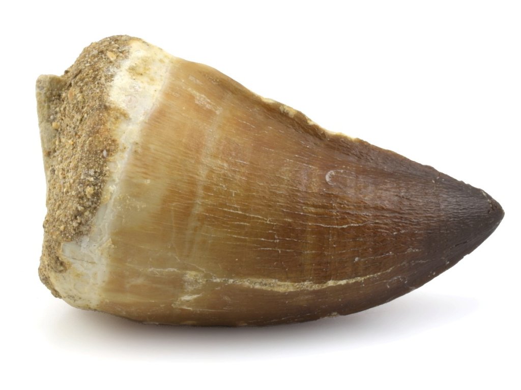 Volný výběrový zub obřího mořského fosilního plaza - mosasaura Thalassotitan atrox.