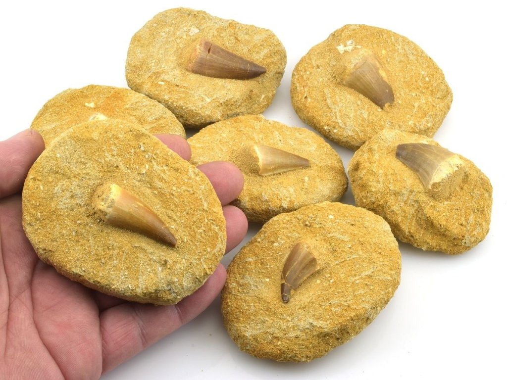 Pravý fosilní zub mosasaura upevněný na hornině, která napodobuje původní nálezový stav. Jde o kompozici, kdy jsou jak hornina, tak samotný zub pravé, avšak zub byl na podložní horninu dodatečně umístěn a zakomponován tak, aby vytvářel dojem původního uložení.