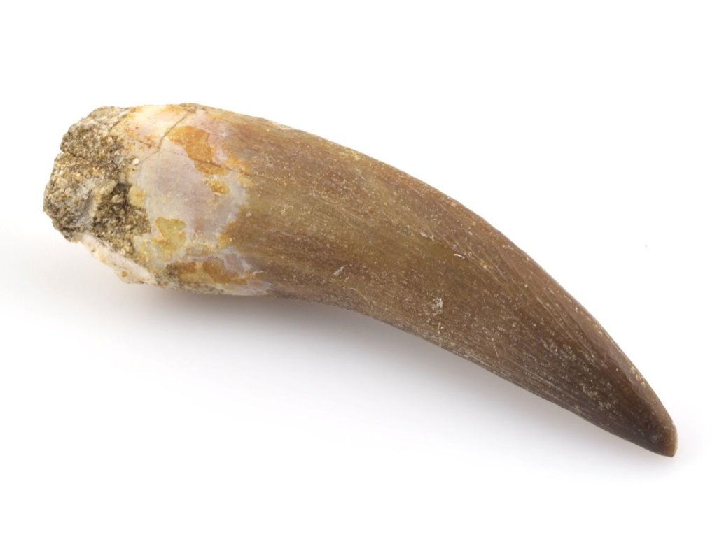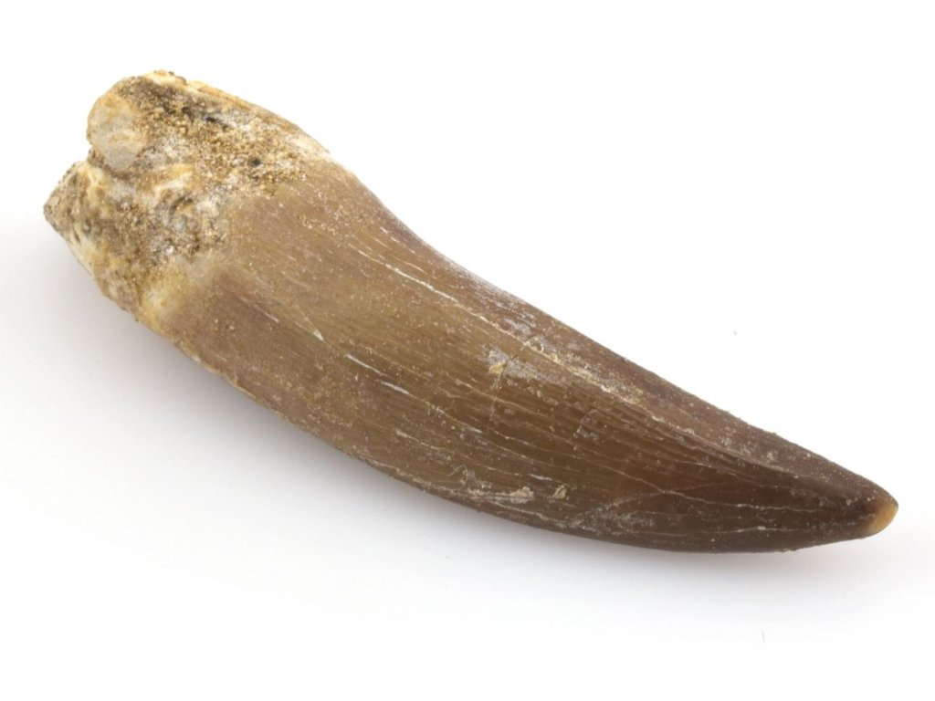 Zub plesiosaura Zarafasaura oceanis z Maroka s typickým rýhováním.
