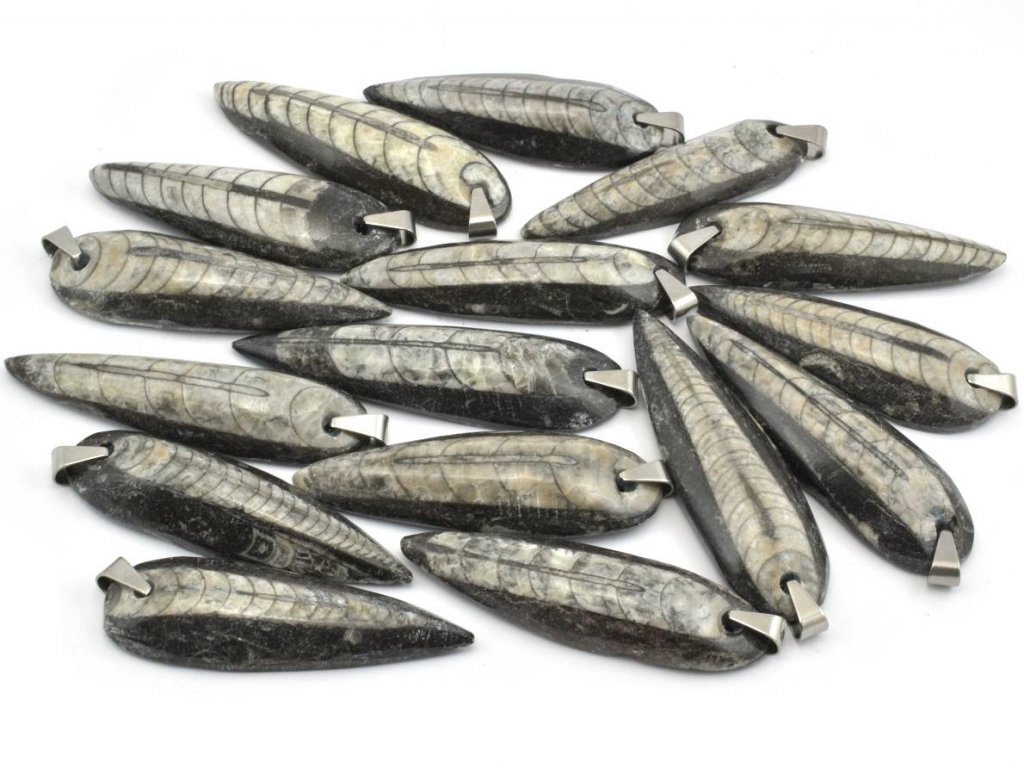 Přívěsek z leštěného orthocerového vápence s jednicem fosilního hlavonožce. Kovodíl je vyroben z nerezové oceli.