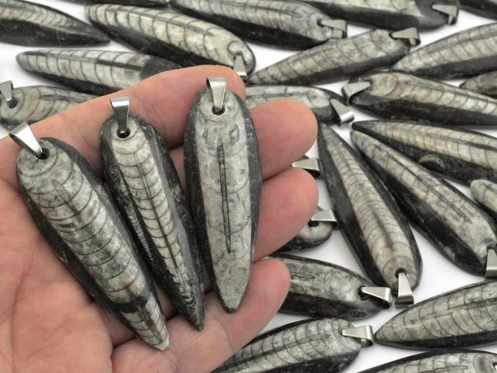 Přívěsek z leštěného orthocerového vápence s jednicem fosilního hlavonožce. Kovodíl je vyroben z nerezové oceli.