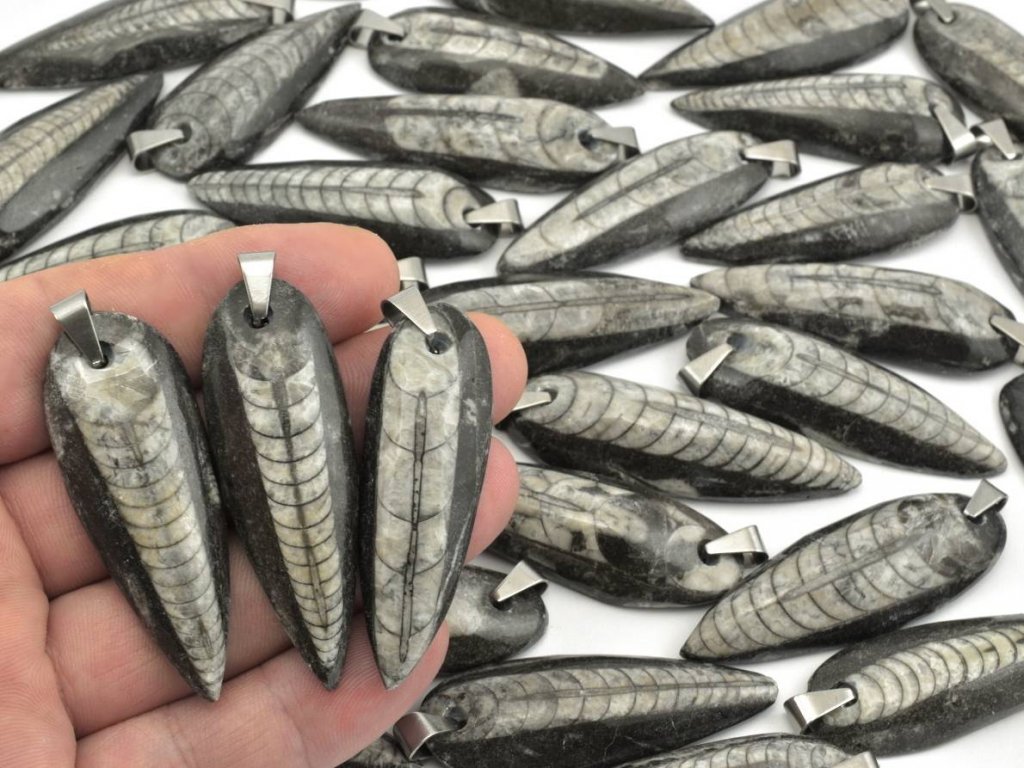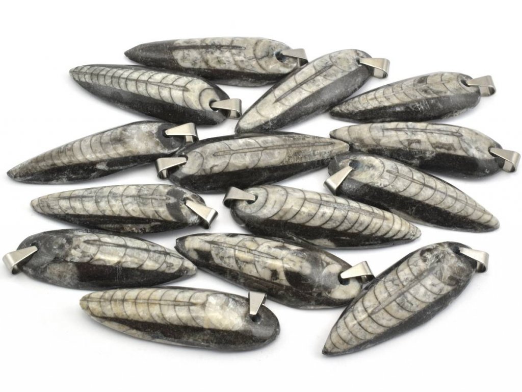 Přívěsek z leštěného orthocerového vápence s jednicem fosilního hlavonožce s kovodílem z nerezové oceli.