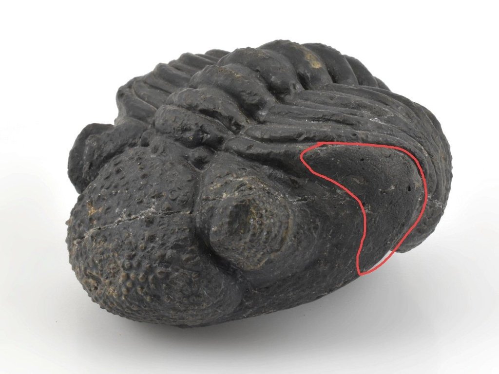 U tohoto trilobita byla částečně rekonstruována pravá líce (při pohledu zepředu) a také prasklina vedoucí přes hlavu. Na vybrané fotografii jsou tyto rekonstrukce vyznačeny červeně. Jde o velmi pěkný a méně častý exemplář trilobita ve stočené poloze. Trilobit je zcela vyjmutý z horniny.