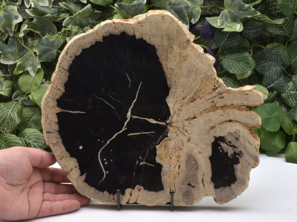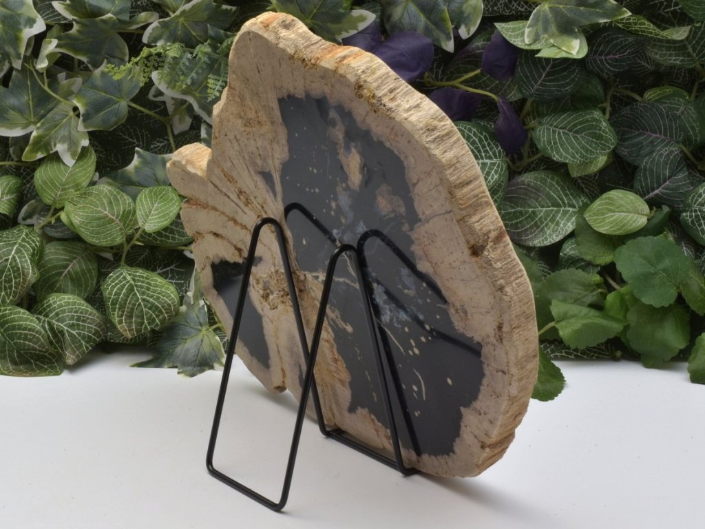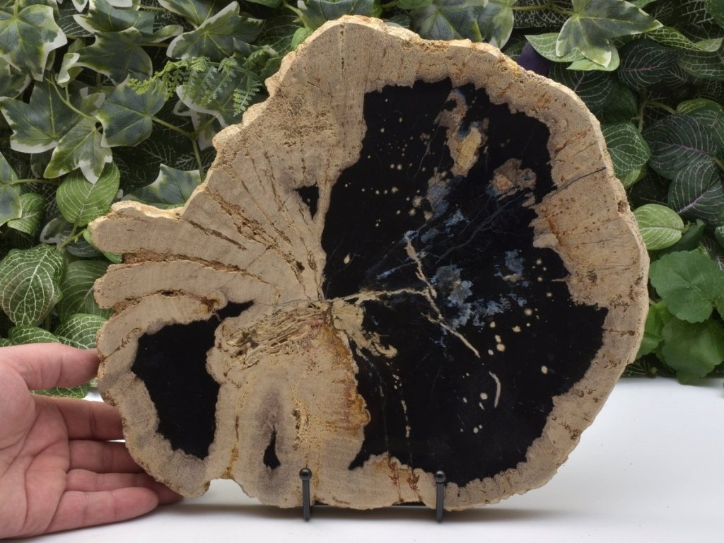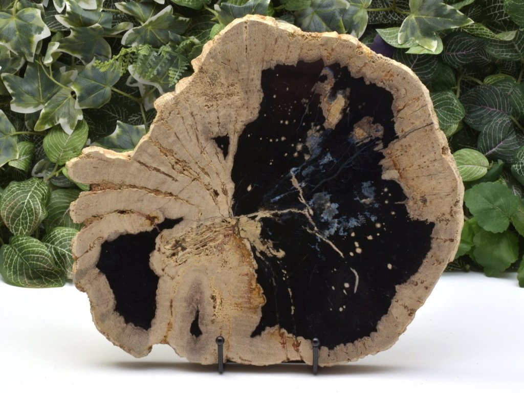 Velký kus zkamenělého dřeva, pocházející z exotického ostrova Jáva v Indonésii. Oboustranně leštěný plát o hmotnosti 3,5 kg je průřezem zkamenělého kmenu neurčeného druhu tropického dřeva. Plát se vyznačuje výrazným barevným kontrastem jemné krémové a sytě černé barvy, přičemž je zachována unikátní struktura původního dřeva.