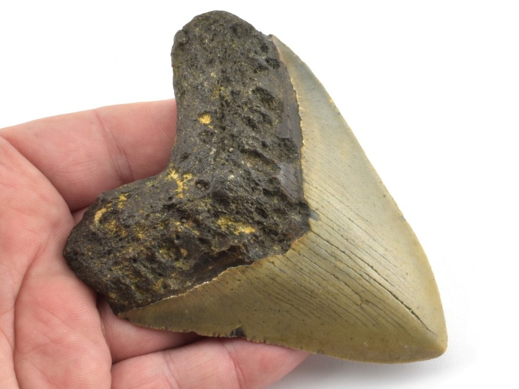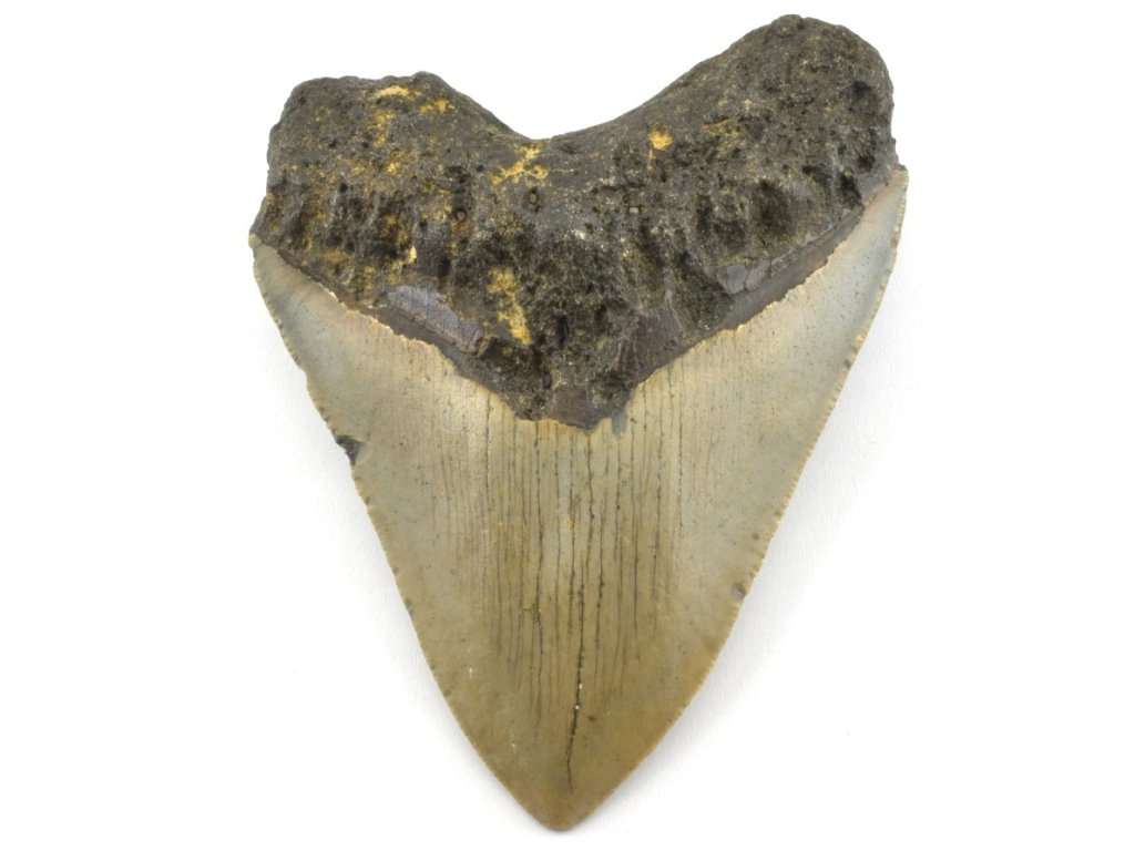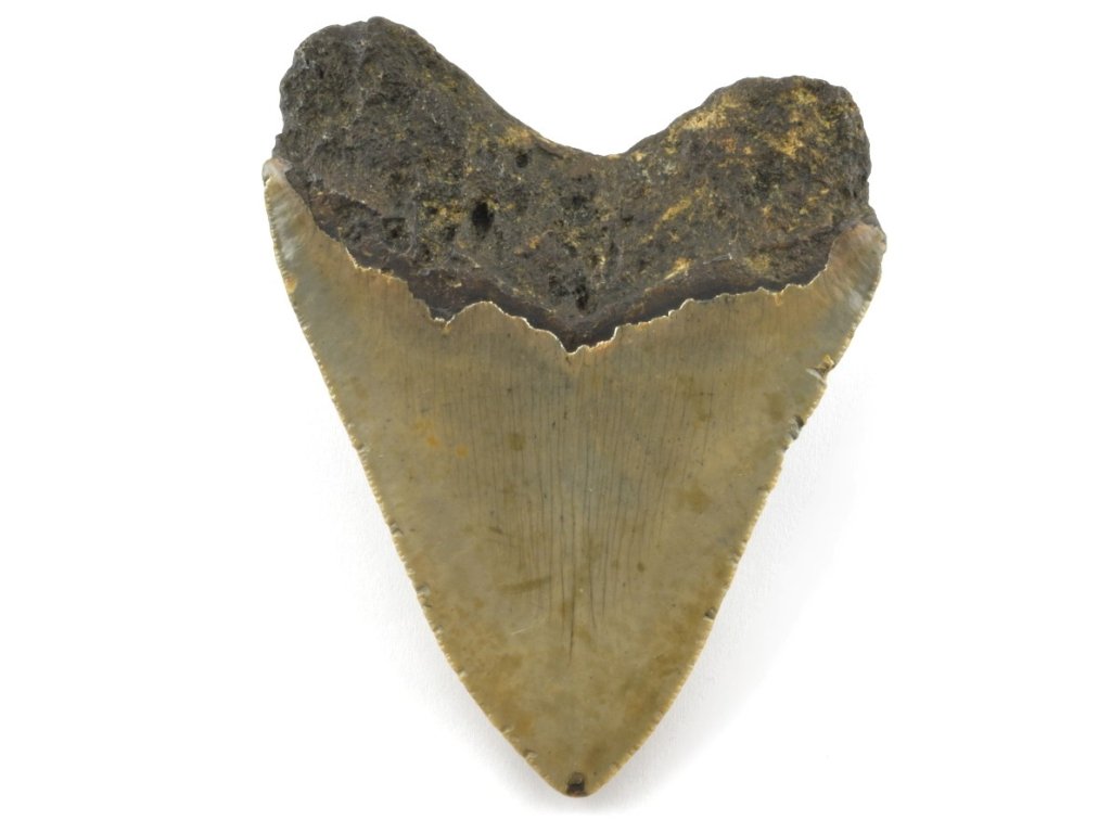 Tento zkamenělý zub patří legendárnímu žralokovi Carcharocles (otodus) megalodon, jednomu z největších predátorů, jaký kdy brázdil oceány. Zub pochází z období miocénu, konkrétně ze svrchní části této epochy zvané serravall. Místem nálezu je Severní Karolína, USA.