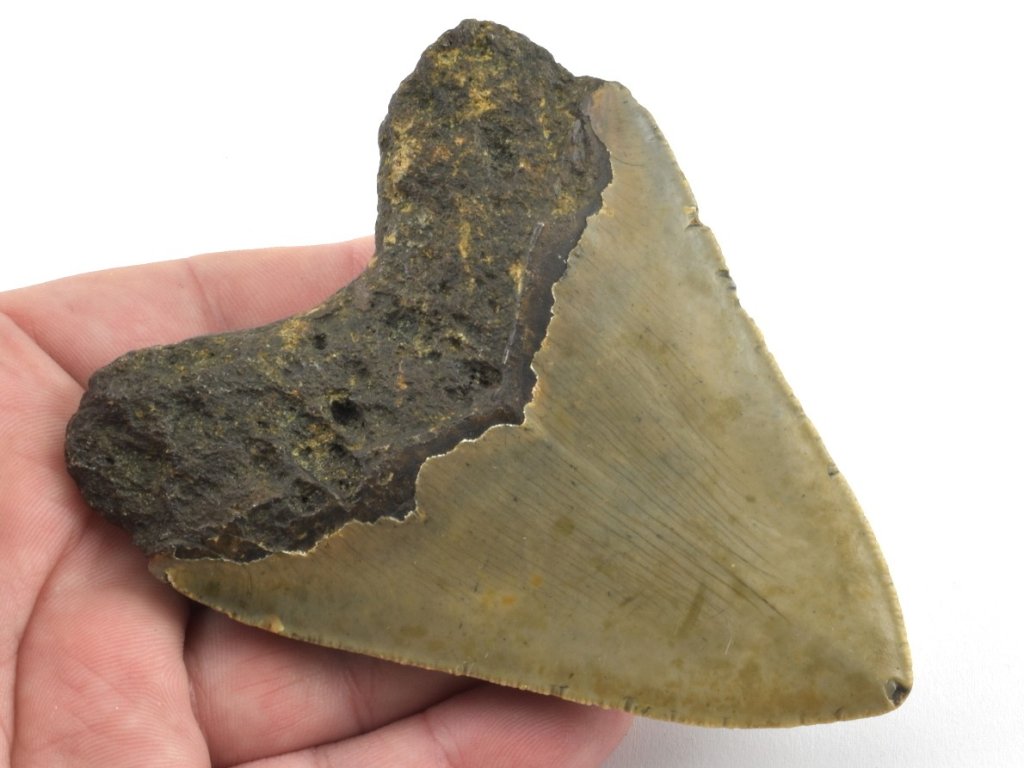 Zub megalodona byl měřen: nejdelší rozměr (od špičku zubu po konec dásně) x šířka (v oblasti konců dásně).