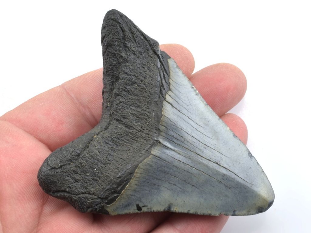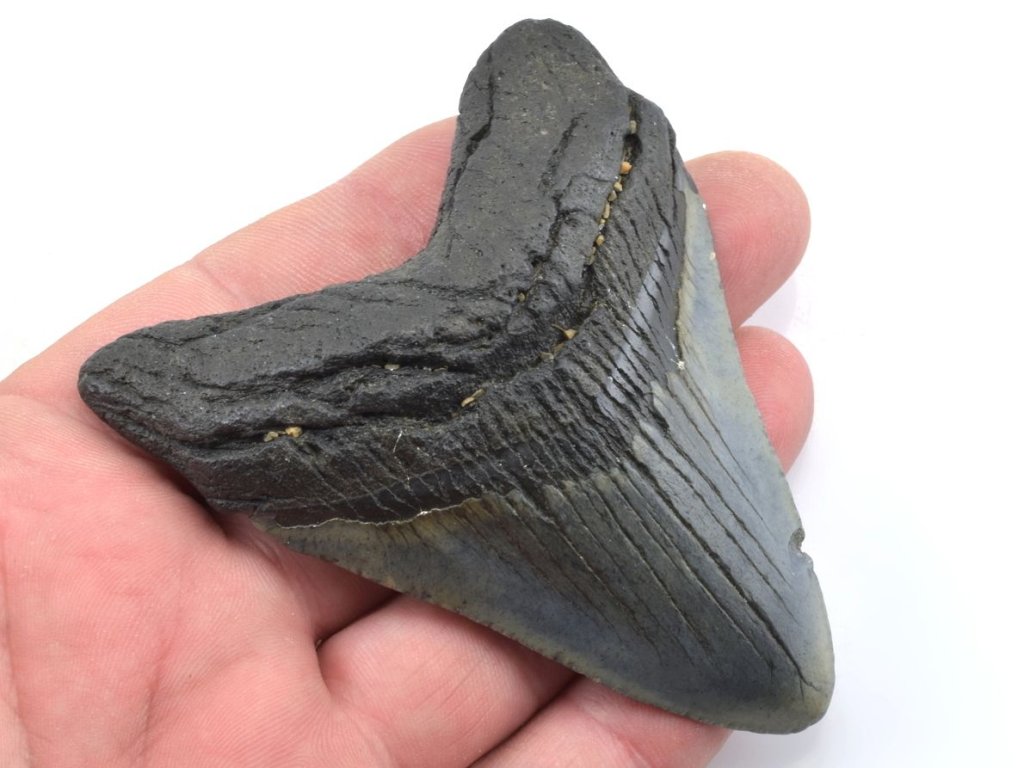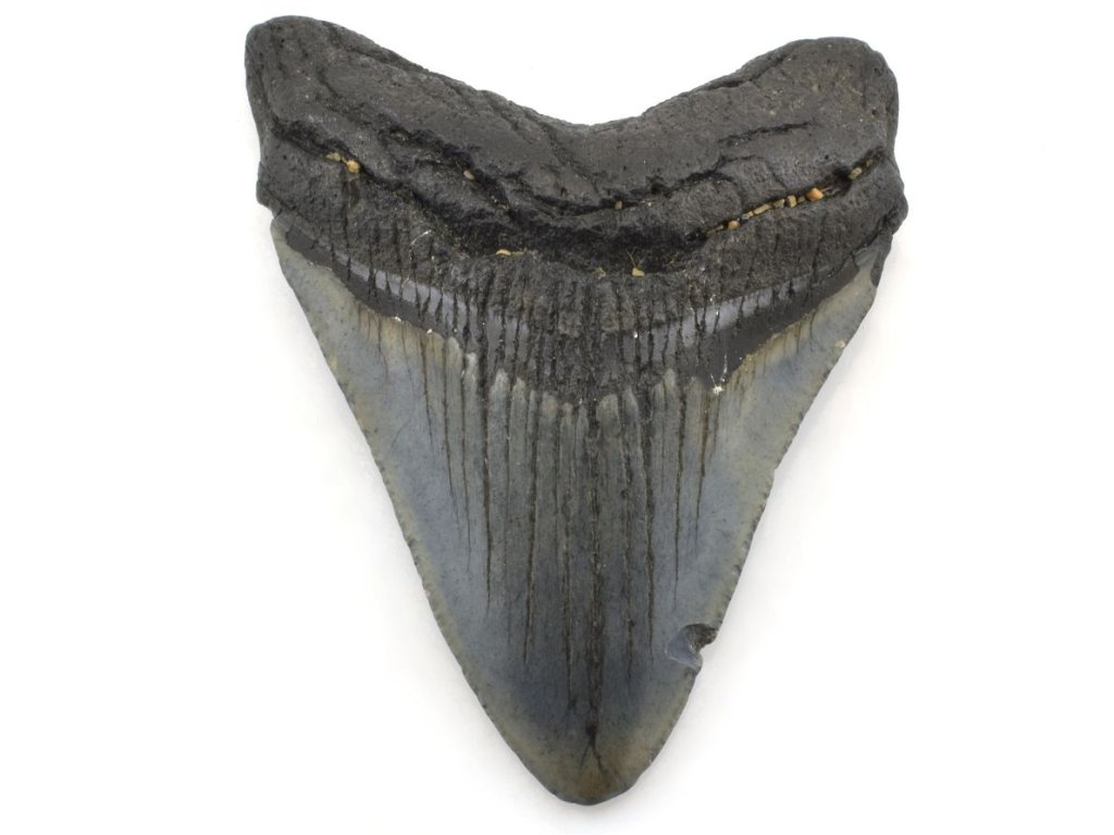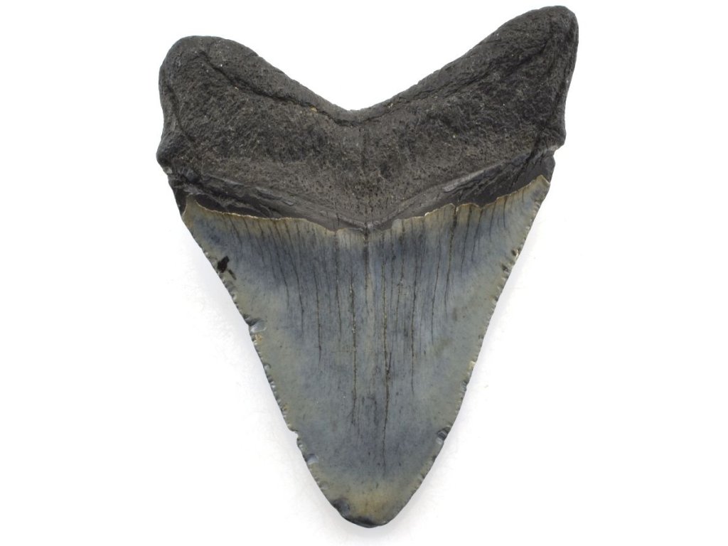 Tento zkamenělý zub patří legendárnímu žralokovi Carcharocles (otodus) megalodon, jednomu z největších predátorů, jaký kdy brázdil oceány. Zub pochází z období miocénu, konkrétně ze svrchní části této epochy zvané serravall. Místem nálezu je Severní Karolína, USA.