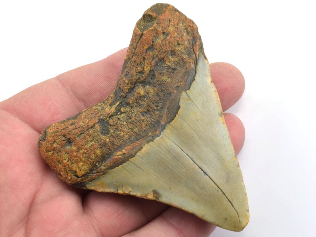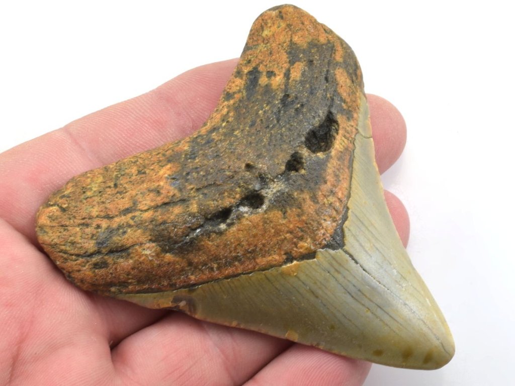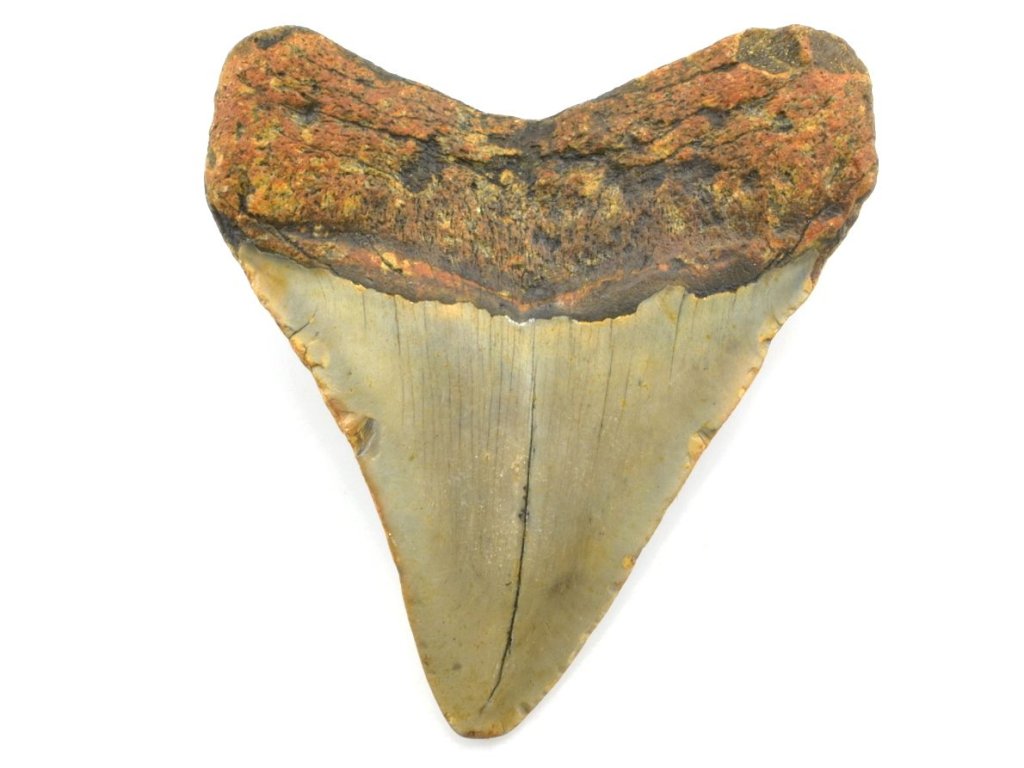Tento zkamenělý zub patří legendárnímu žralokovi Carcharocles (otodus) megalodon, jednomu z největších predátorů, jaký kdy brázdil oceány. Zub pochází z období miocénu, konkrétně ze svrchní části této epochy zvané serravall. Místem nálezu je Severní Karolína, USA.