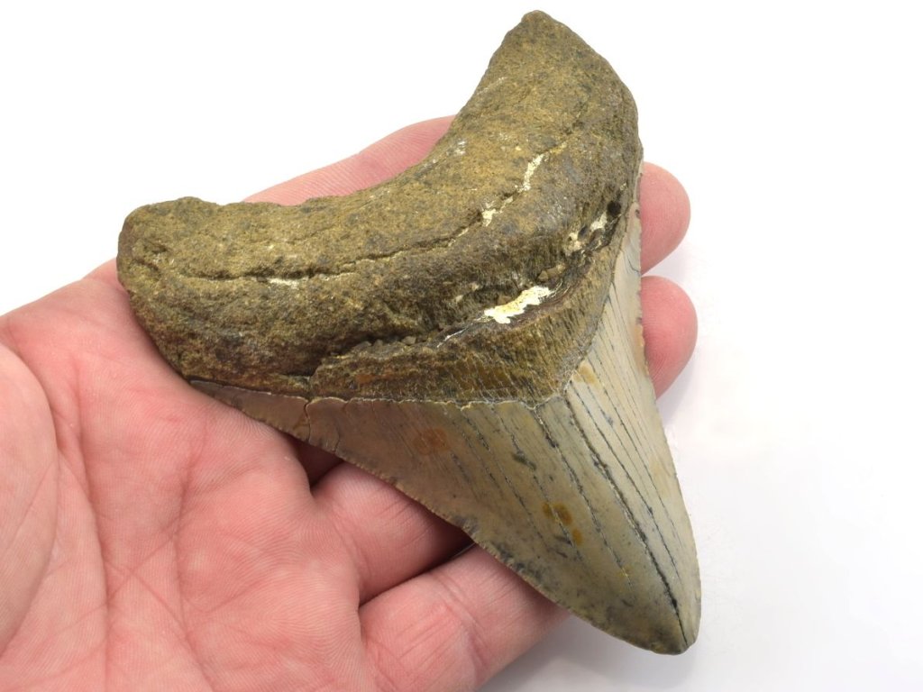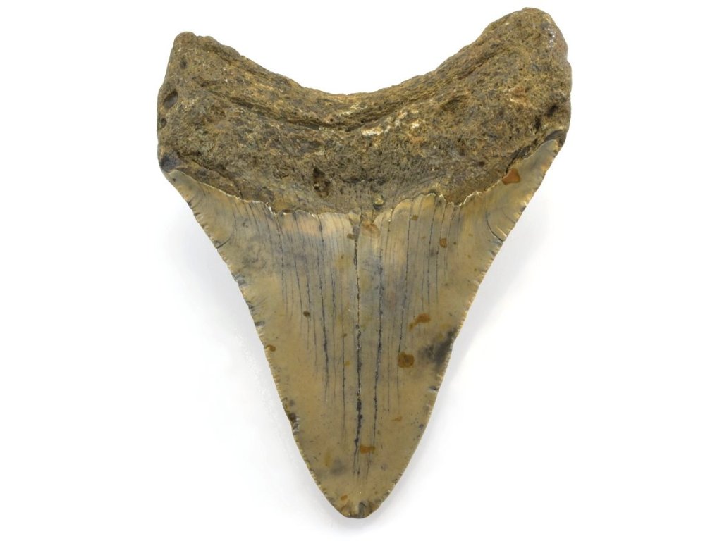 Tento zkamenělý zub patří legendárnímu žralokovi Carcharocles (otodus) megalodon, jednomu z největších predátorů, jaký kdy brázdil oceány. Zub pochází z období miocénu, konkrétně ze svrchní části této epochy zvané serravall. Místem nálezu je Severní Karolína, USA.