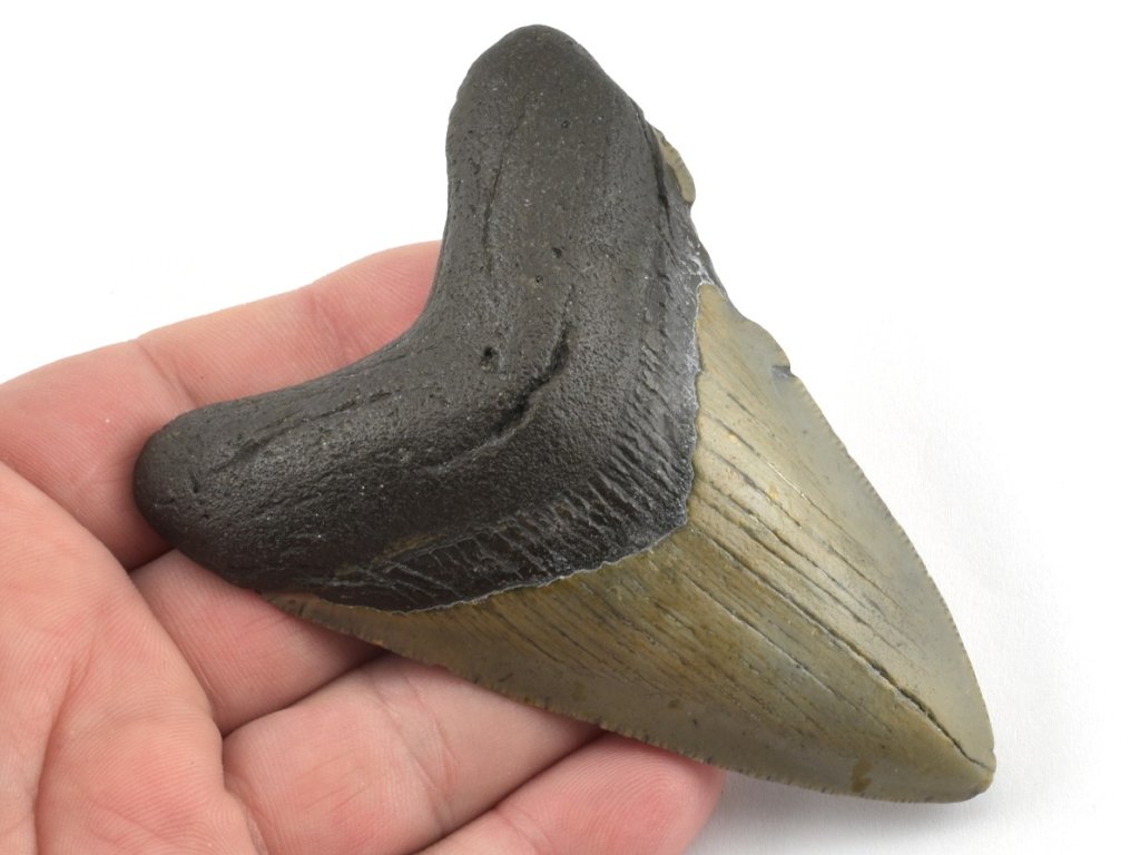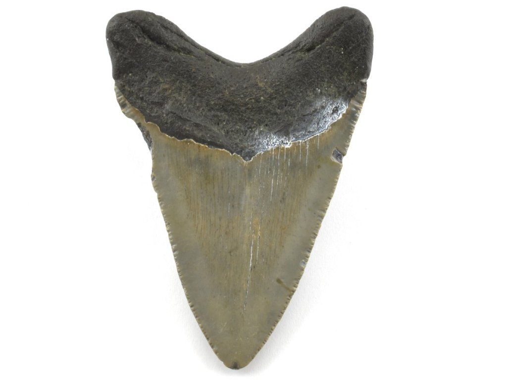 Tento zkamenělý zub patří legendárnímu žralokovi Carcharocles (otodus) megalodon, jednomu z největších predátorů, jaký kdy brázdil oceány. Zub pochází z období miocénu, konkrétně ze svrchní části této epochy zvané serravall. Místem nálezu je Severní Karolína, USA.