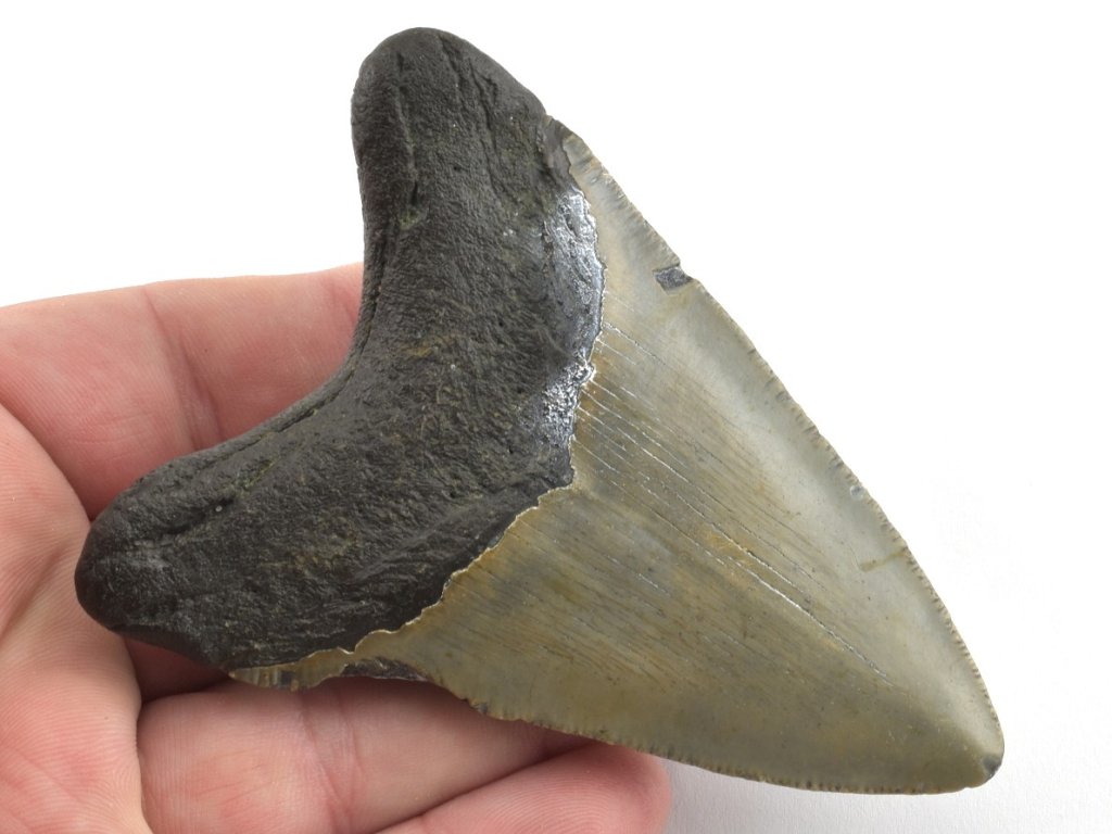 Zub megalodona byl měřen: nejdelší rozměr (od špičku zubu po konec dásně) x šířka (v oblasti konců dásně).