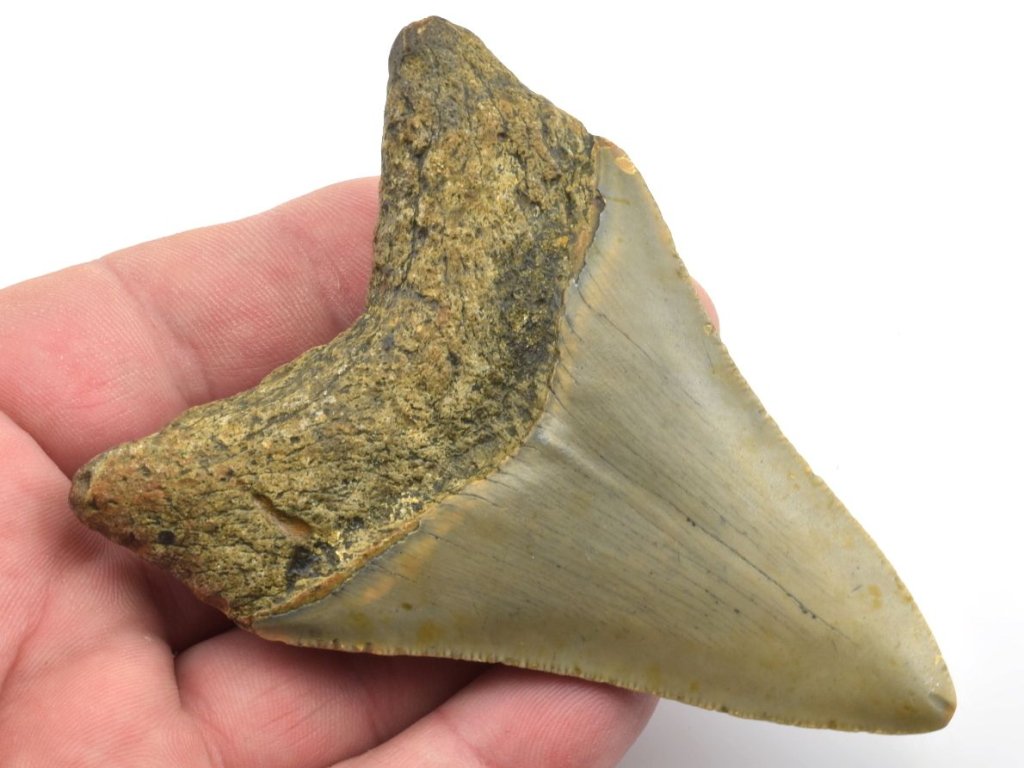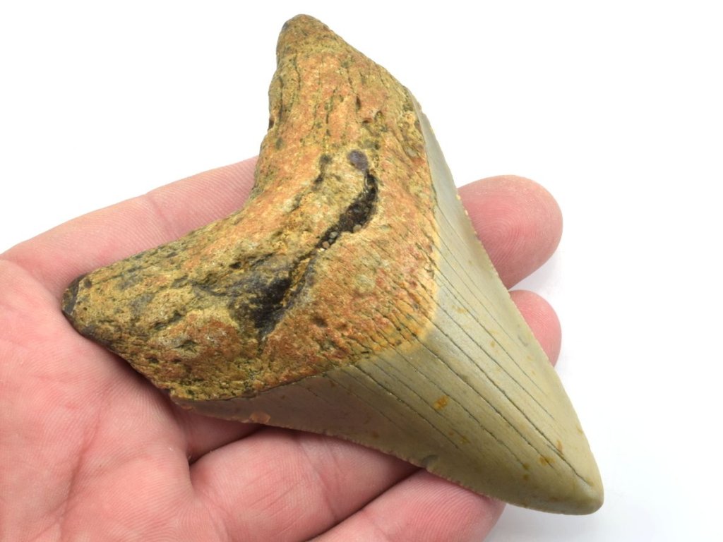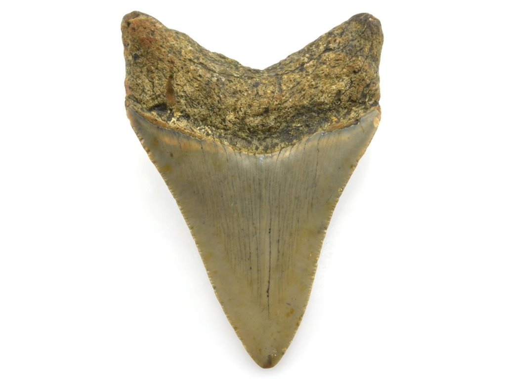 Tento zkamenělý zub patří legendárnímu žralokovi Carcharocles (otodus) megalodon, jednomu z největších predátorů, jaký kdy brázdil oceány. Zub pochází z období miocénu, konkrétně ze svrchní části této epochy zvané serravall. Místem nálezu je Severní Karolína, USA.