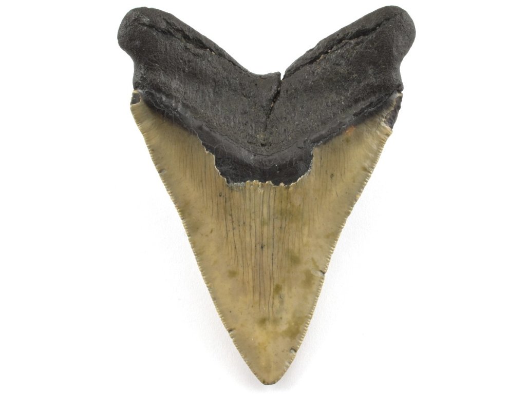 Tento zkamenělý zub patří legendárnímu žralokovi Carcharocles (otodus) megalodon, jednomu z největších predátorů, jaký kdy brázdil oceány. Zub pochází z období miocénu, konkrétně ze svrchní části této epochy zvané serravall. Místem nálezu je Severní Karolína, USA.