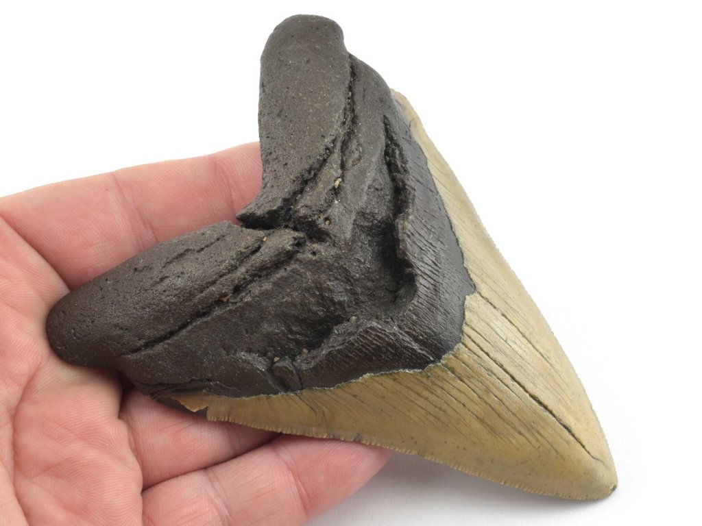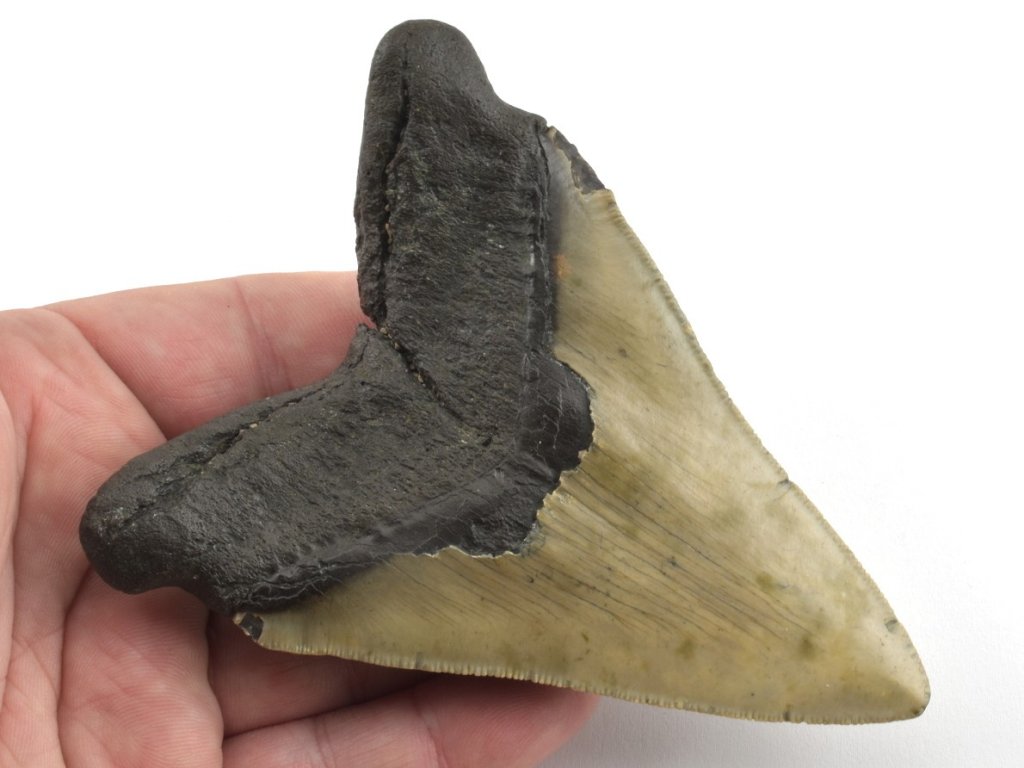 Zub megalodona byl měřen: nejdelší rozměr (od špičku zubu po konec dásně) x šířka (v oblasti konců dásně).