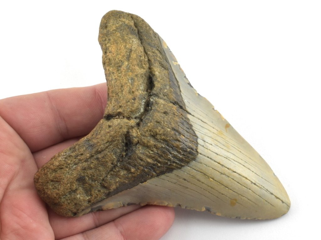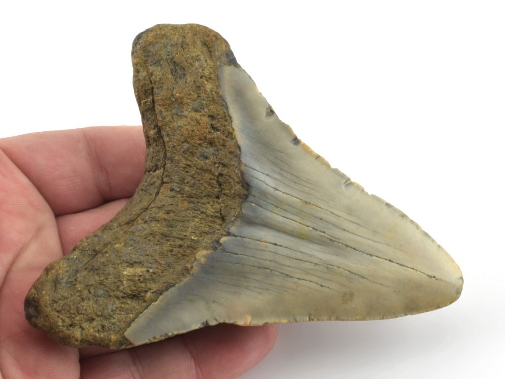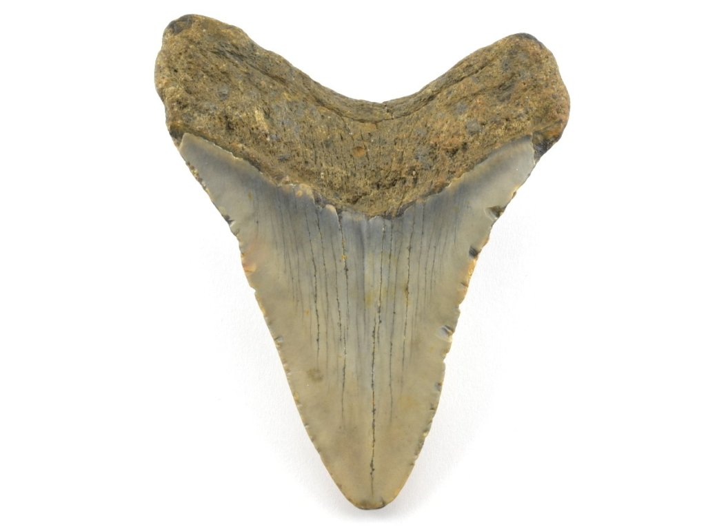 Tento zkamenělý zub patří legendárnímu žralokovi Carcharocles (otodus) megalodon, jednomu z největších predátorů, jaký kdy brázdil oceány. Zub pochází z období miocénu, konkrétně ze svrchní části této epochy zvané serravall. Místem nálezu je Severní Karolína, USA.