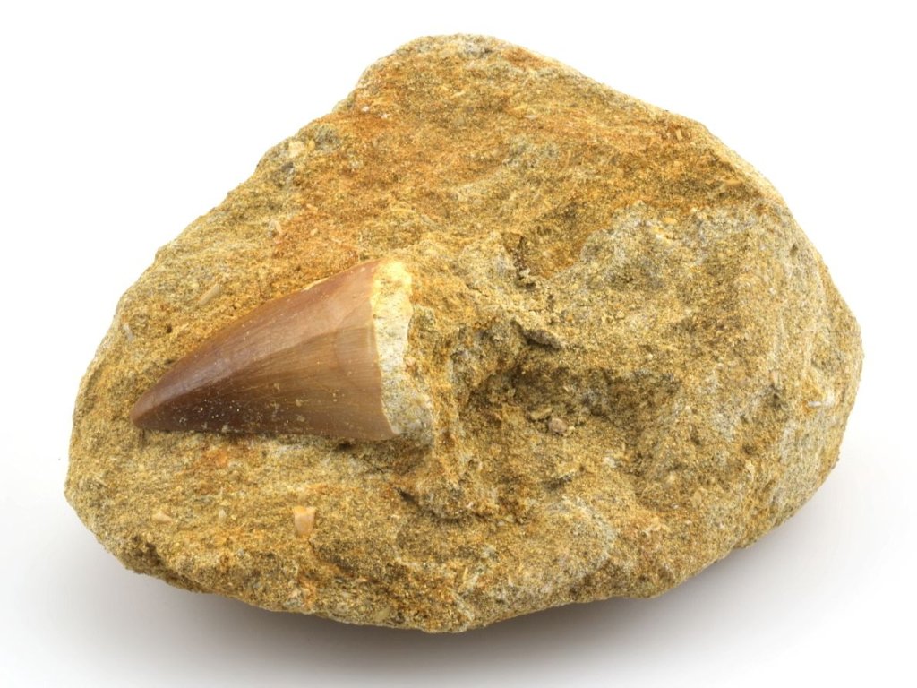 Zkamenělina zubu křídového fosilního plaza Mosasaurus v původní sedimentární hornině.