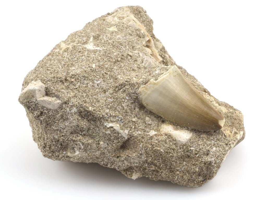 Zkamenělina zubu křídového fosilního plaza Mosasaurus v původní sedimentární hornině.