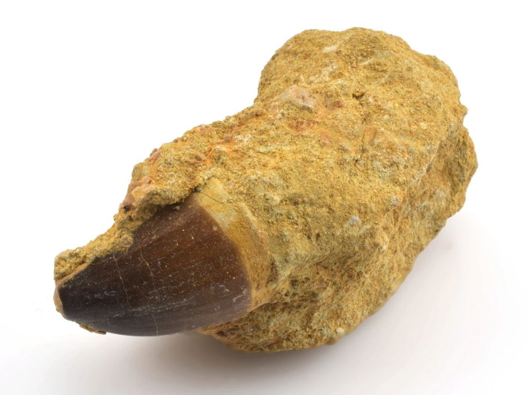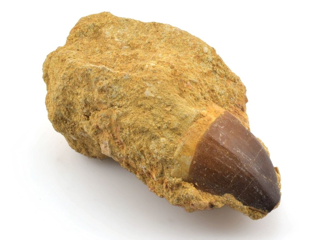 Zkamenělý zub na hornině je cennějším než běžně prodávané volné zuby. Pro sběratele fosilií je takový exemplář atraktivní možností získat vzorek, který zachycuje část dávno zaniklého ekosystému.
