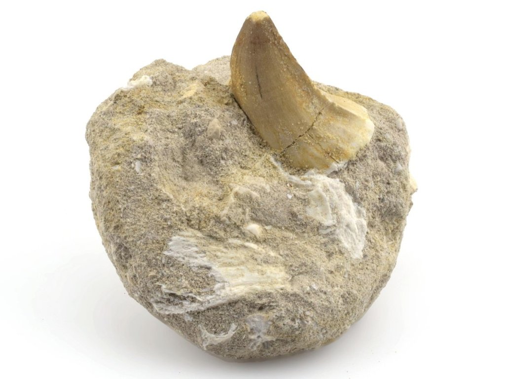 Zkamenělý zub na hornině je cennějším než běžně prodávané volné zuby. Pro sběratele fosilií je takový exemplář atraktivní možností získat vzorek, který zachycuje část dávno zaniklého ekosystému.