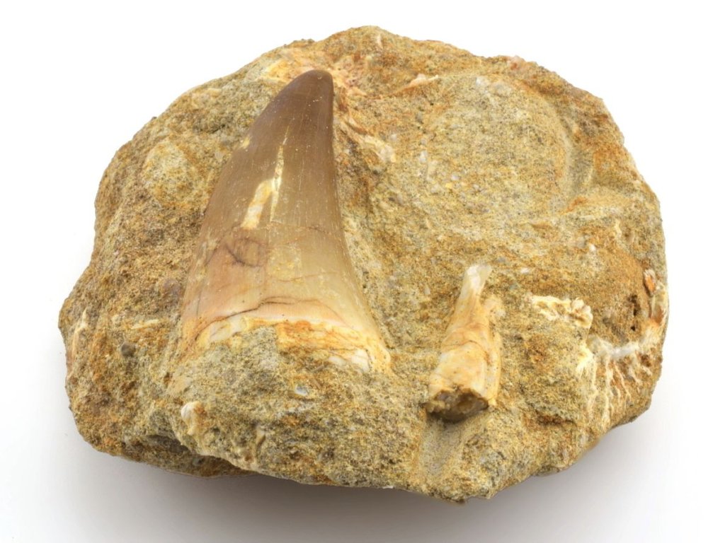 Zkamenělý zub na hornině je cennějším než běžně prodávané volné zuby. Pro sběratele fosilií je takový exemplář atraktivní možností získat vzorek, který zachycuje část dávno zaniklého ekosystému.