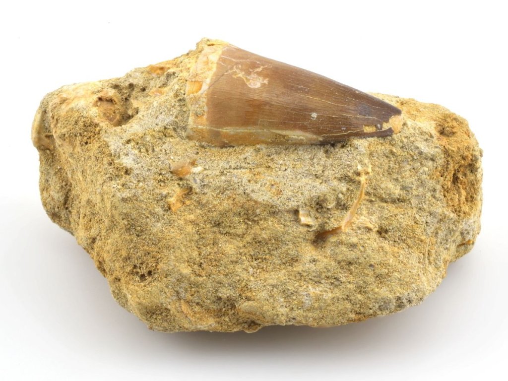 Zkamenělý zub na hornině je cennějším než běžně prodávané volné zuby. Pro sběratele fosilií je takový exemplář atraktivní možností získat vzorek, který zachycuje část dávno zaniklého ekosystému.
