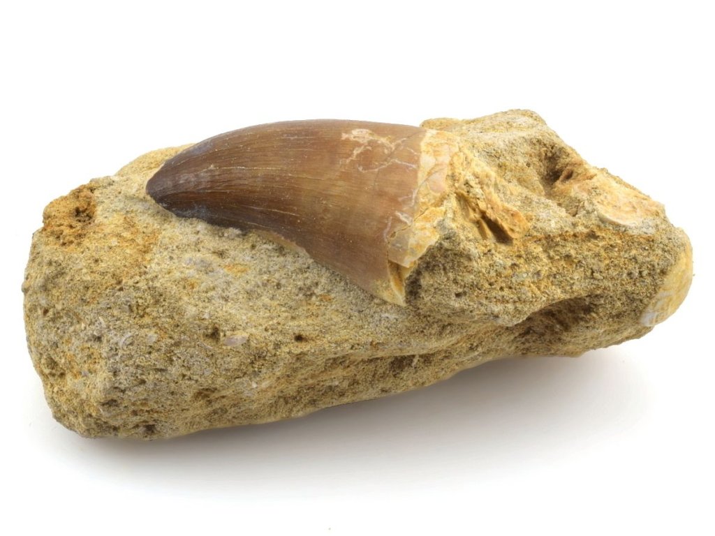 Zkamenělina zubu křídového fosilního plaza Mosasaurus v původní sedimentární hornině.