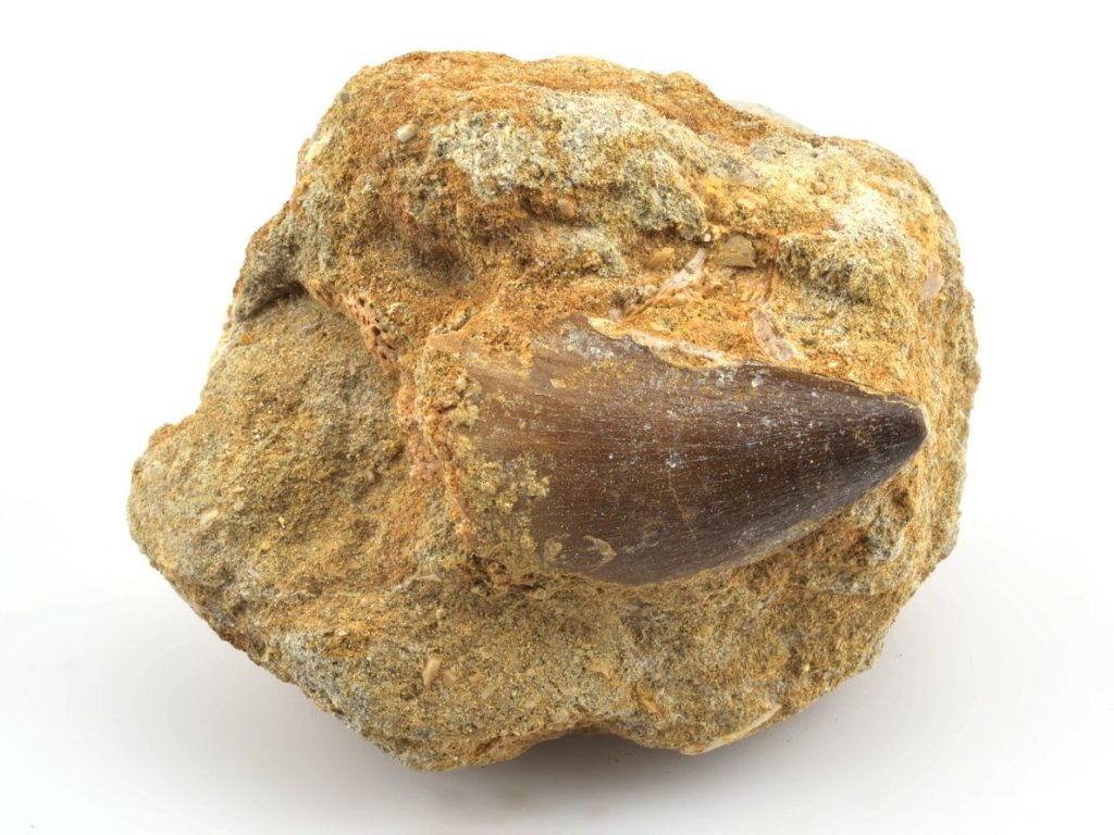 Zkamenělý zub na hornině je cennějším než běžně prodávané volné zuby. Pro sběratele fosilií je takový exemplář atraktivní možností získat vzorek, který zachycuje část dávno zaniklého ekosystému.