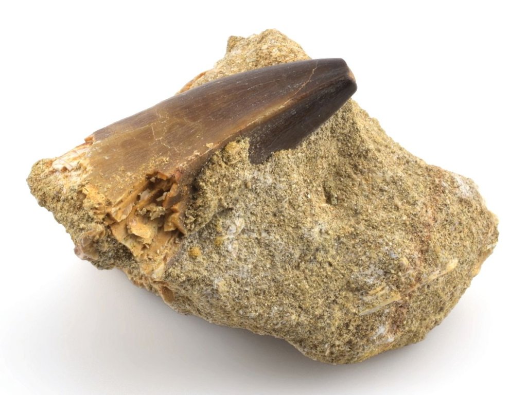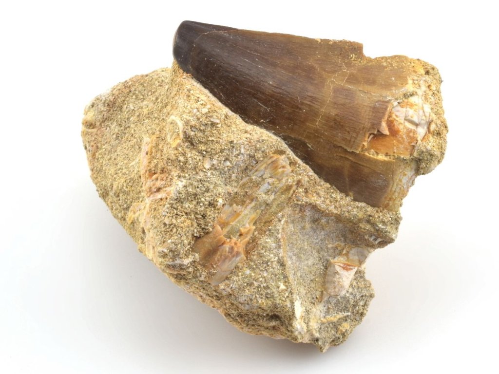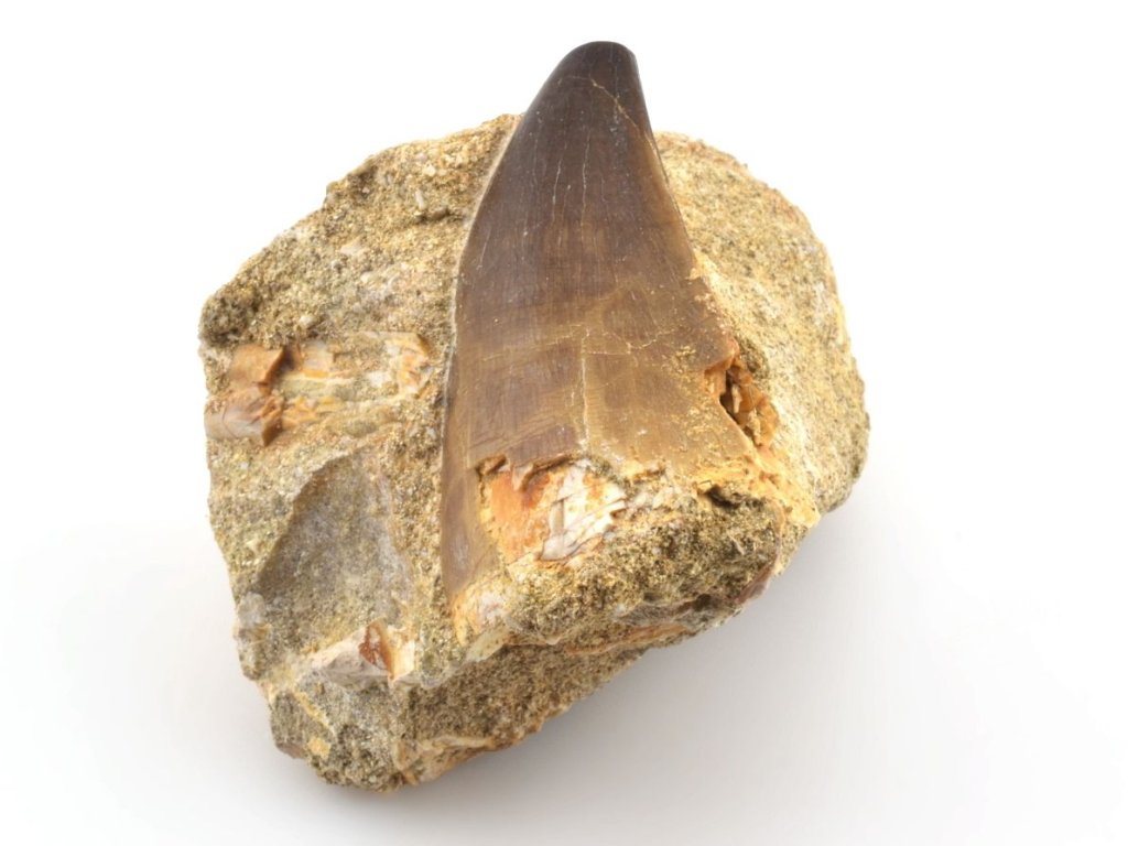 Zkamenělý zub na hornině je cennějším než běžně prodávané volné zuby. Pro sběratele fosilií je takový exemplář atraktivní možností získat vzorek, který zachycuje část dávno zaniklého ekosystému.