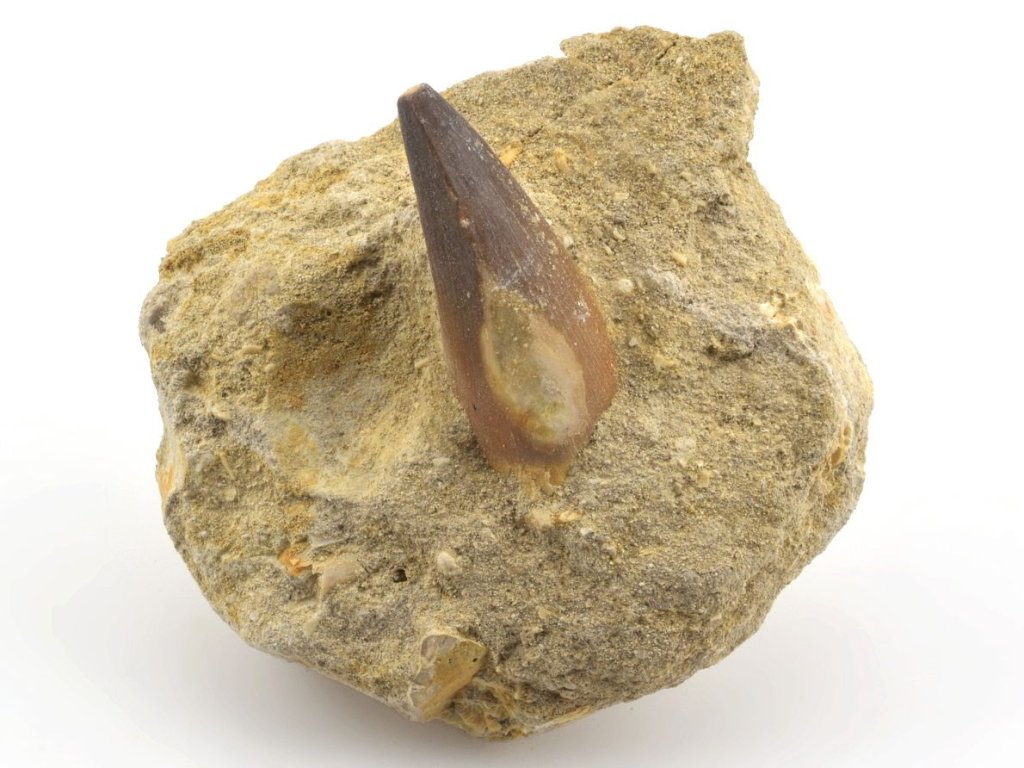 Zkamenělý zub na hornině je cennějším než běžně prodávané volné zuby. Pro sběratele fosilií je takový exemplář atraktivní možností získat vzorek, který zachycuje část dávno zaniklého ekosystému.
