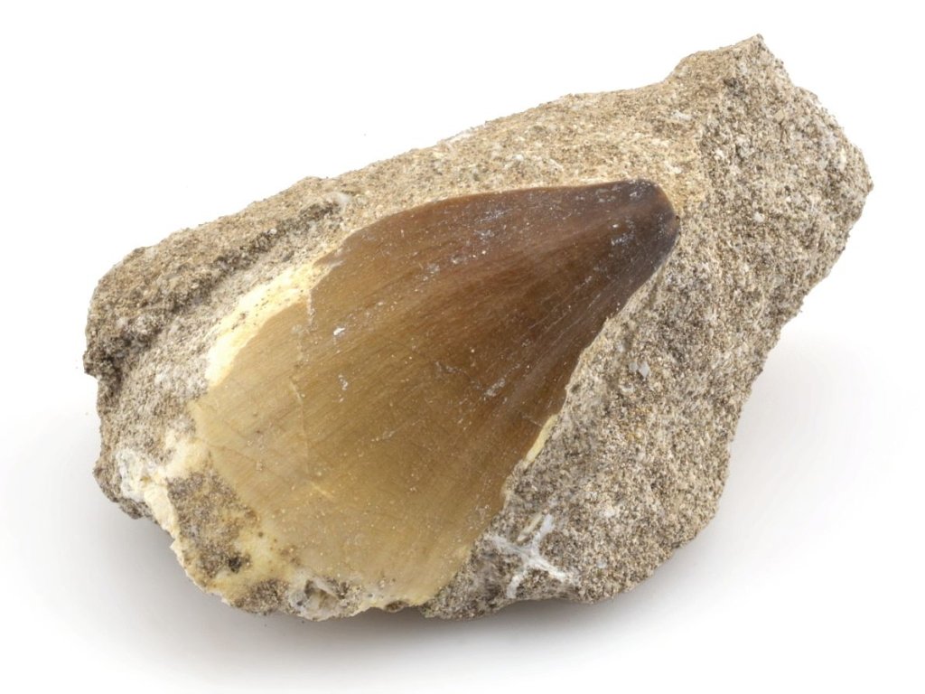 Zkamenělina zubu křídového fosilního plaza Mosasaurus v původní sedimentární hornině.