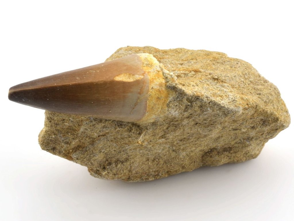 Zkamenělý zub na hornině je cennějším než běžně prodávané volné zuby. Pro sběratele fosilií je takový exemplář atraktivní možností získat vzorek, který zachycuje část dávno zaniklého ekosystému.