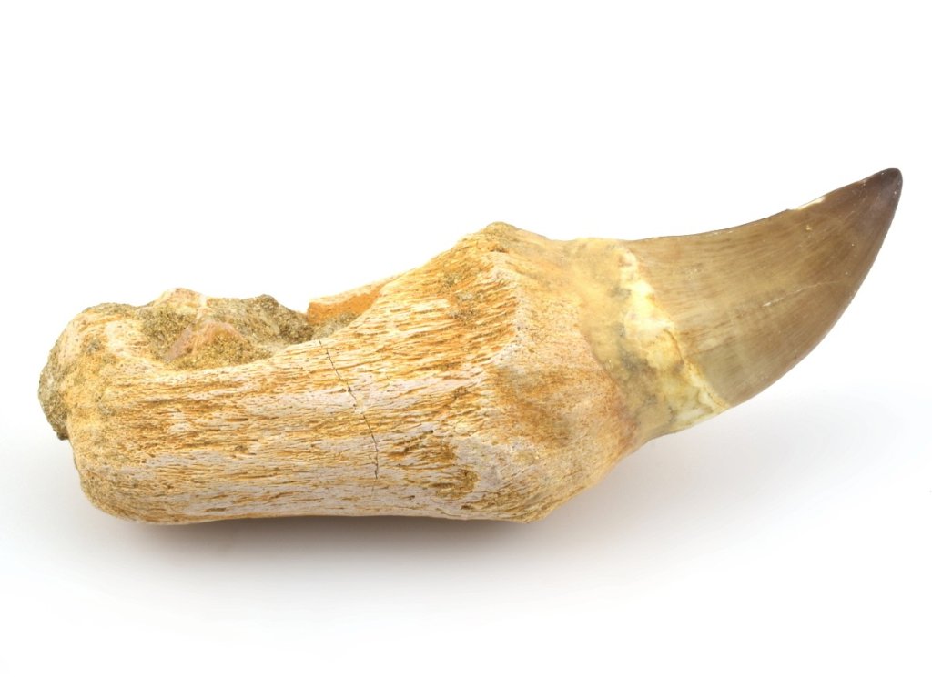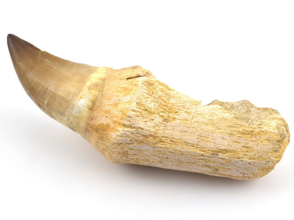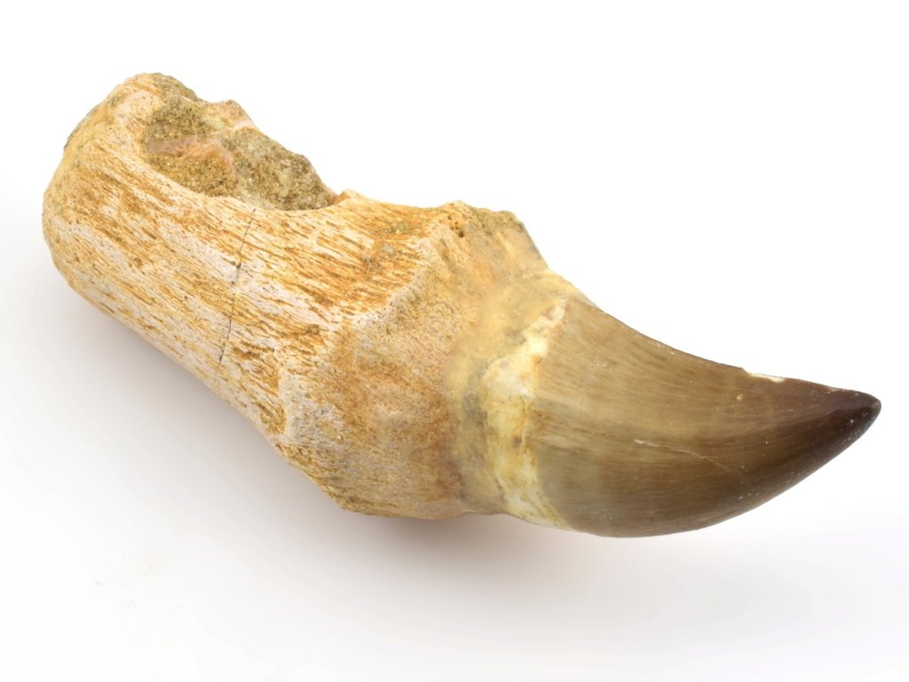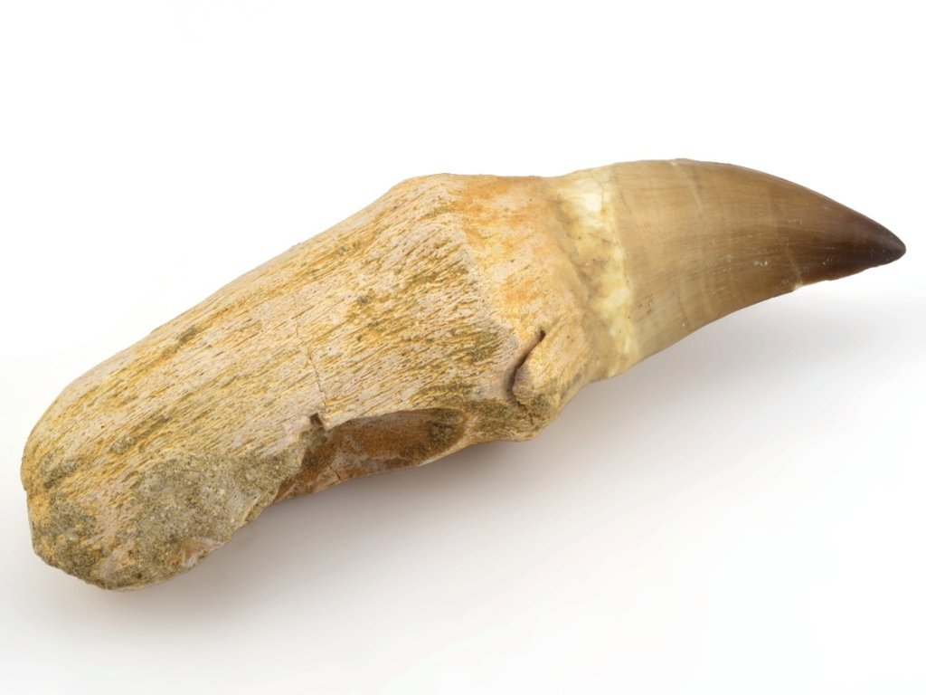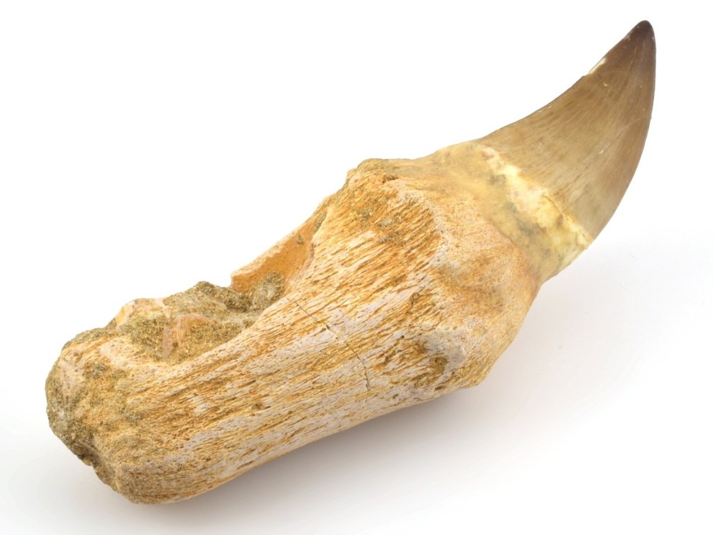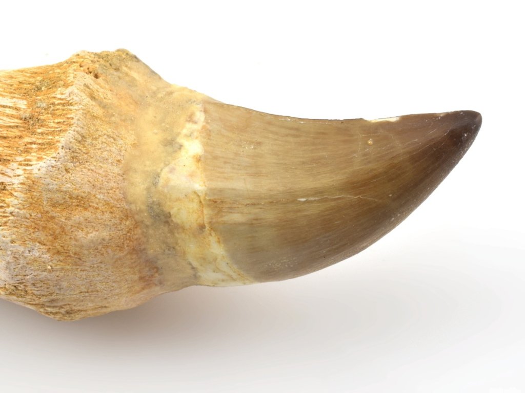 Tento zub je kompozitní – korunka a kořen pocházejí z různých jedinců a následně byly spojeny do jednoho exponátu. Na rozdíl od mnoha kompozitů však tento kus zachovává plnou fosilní autenticitu: jak samotná korunka, tak i kořen jsou pravé zkameněliny, nikoli doplněné či vyrobené náhrady z opracované kosti z jiné části fosilie.